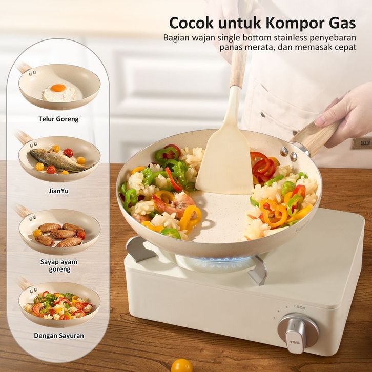 New Freemir Wajan Penggorengan 20/24 Cm Anti Lengket Beige Gagang Kayu Halus Anti Slip