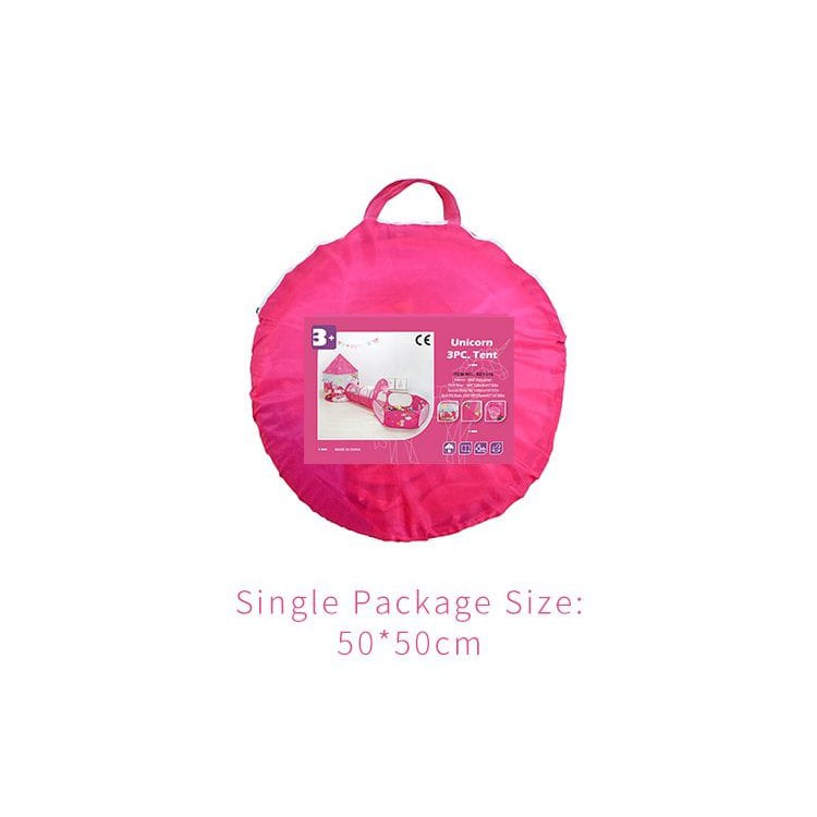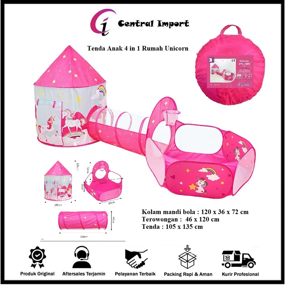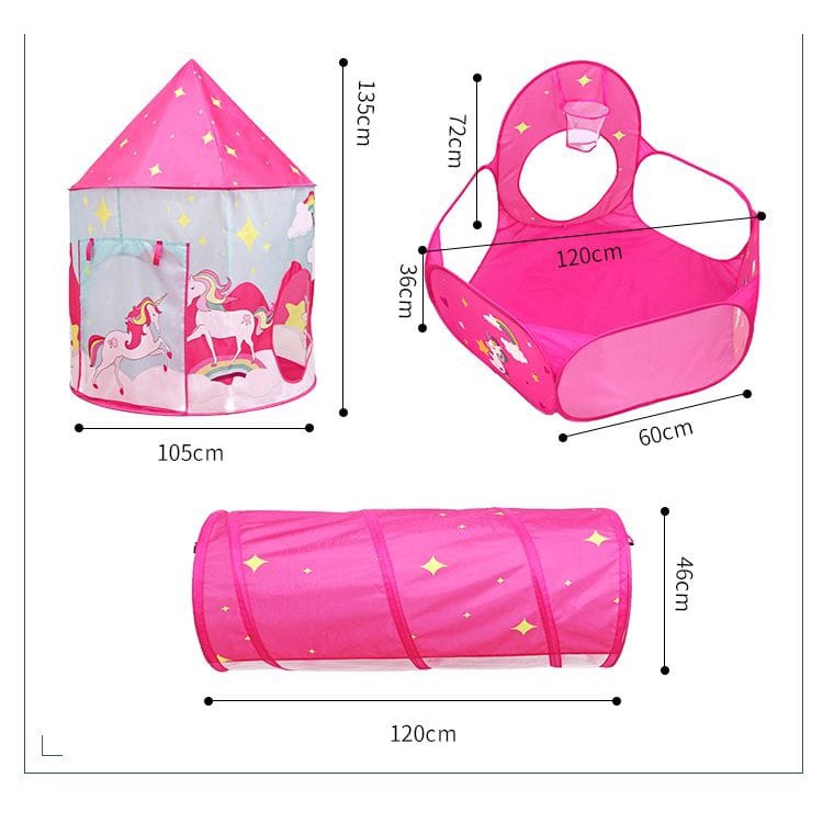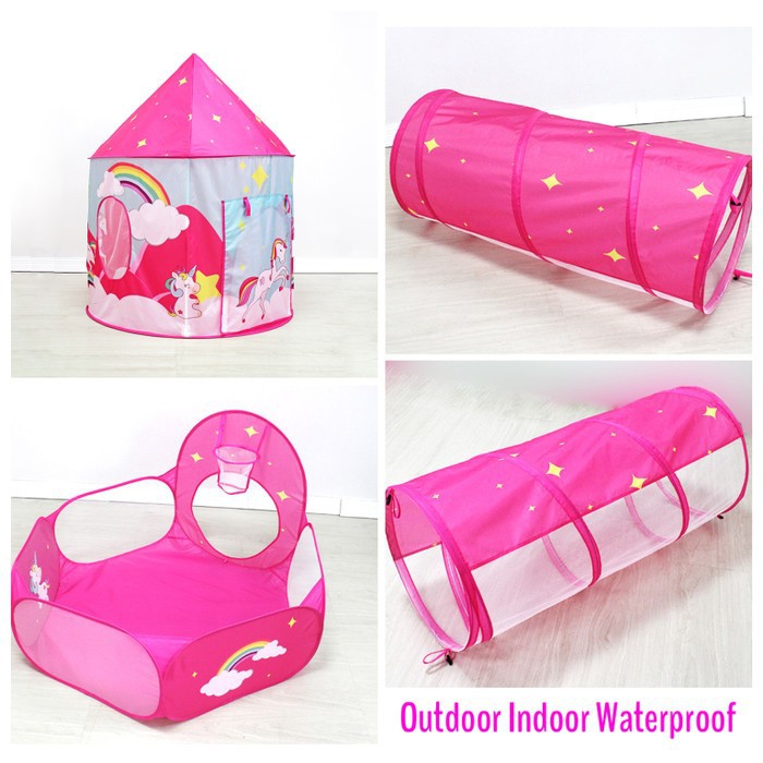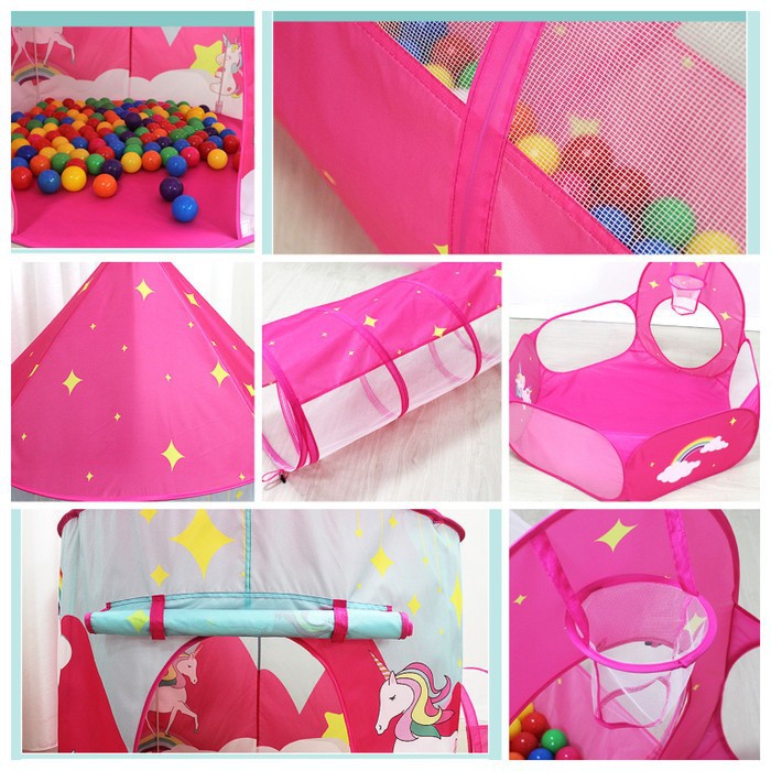 Tenda Anak 4 in 1 Rumah Unicorn , Terowongan, Ring Basket, Kolam - Pink