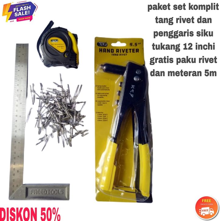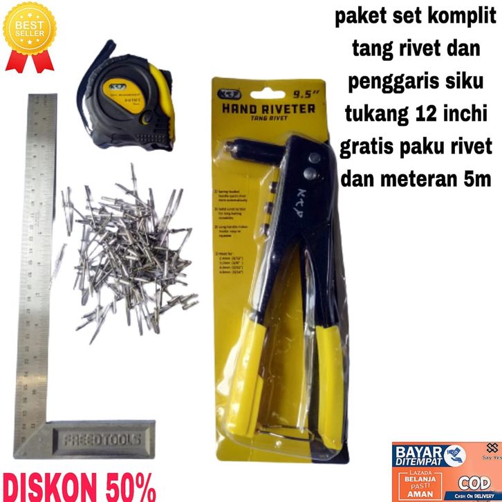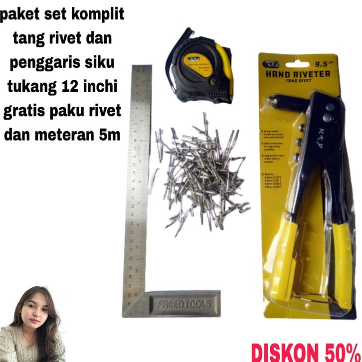paket tang set komplit tang rivet dan penggaris siku tukang 12 inchi dan meteran 5m gratis paku