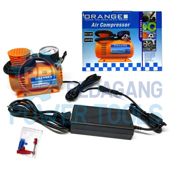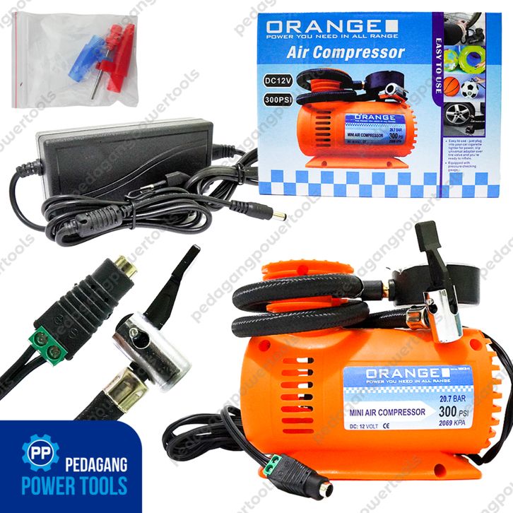 PAKET ORANGE KOMPRESOR ANGIN MINI POMPA BAN MOBIL & ADAPTOR 12V 5A