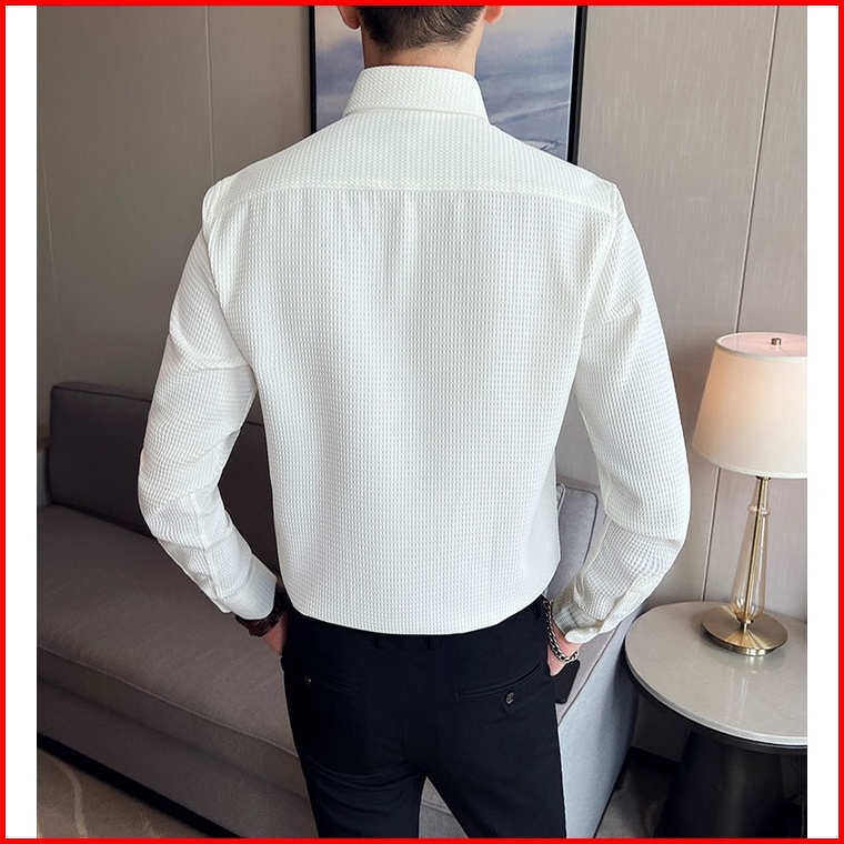 Safa Factory - Kemeja Pria Waffle Knit Baju Atasan Pria Lengan Panjang Motif Polos Slimfit Putih