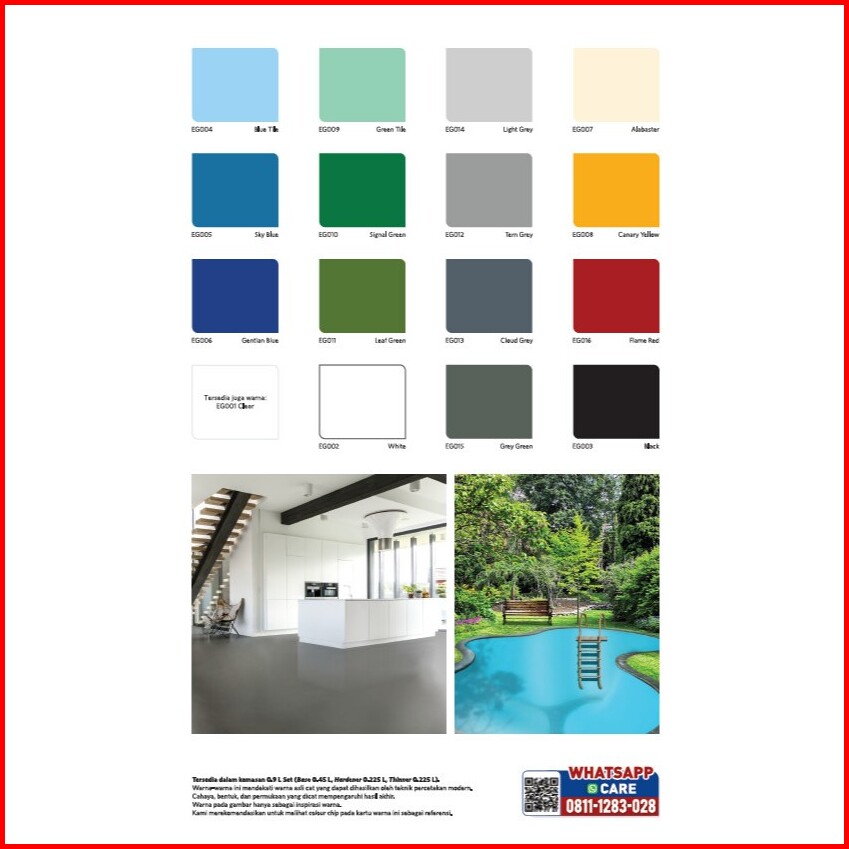 BELAZO BEPOXY CLEAR, EPOXY GUARD CLEAR, EPOXY GUARD 15 WARNA, MX 99 CLEAR, MX 99 12 WARNA, EPODUR 19 WARNA, CLEAR, WHITE, BLACK, ALABASTER, TERN GREY, CLOUD GREY, SIGNAL RED, CANARY YELLOW, GREEN TILE, SIGNAL GREEN, GREY GREEN, EGGSHELL GREEN, SKY BLUE, MEDIUM BLUE, BLUE TILE, 01 PURE WHITE, 02 STONE GREY, 03 FOREST GREEN, 04 ROSE RED, 05 BABY BLUE, 06 LEMON CREAM, 07 OBSIDIAN BLACK