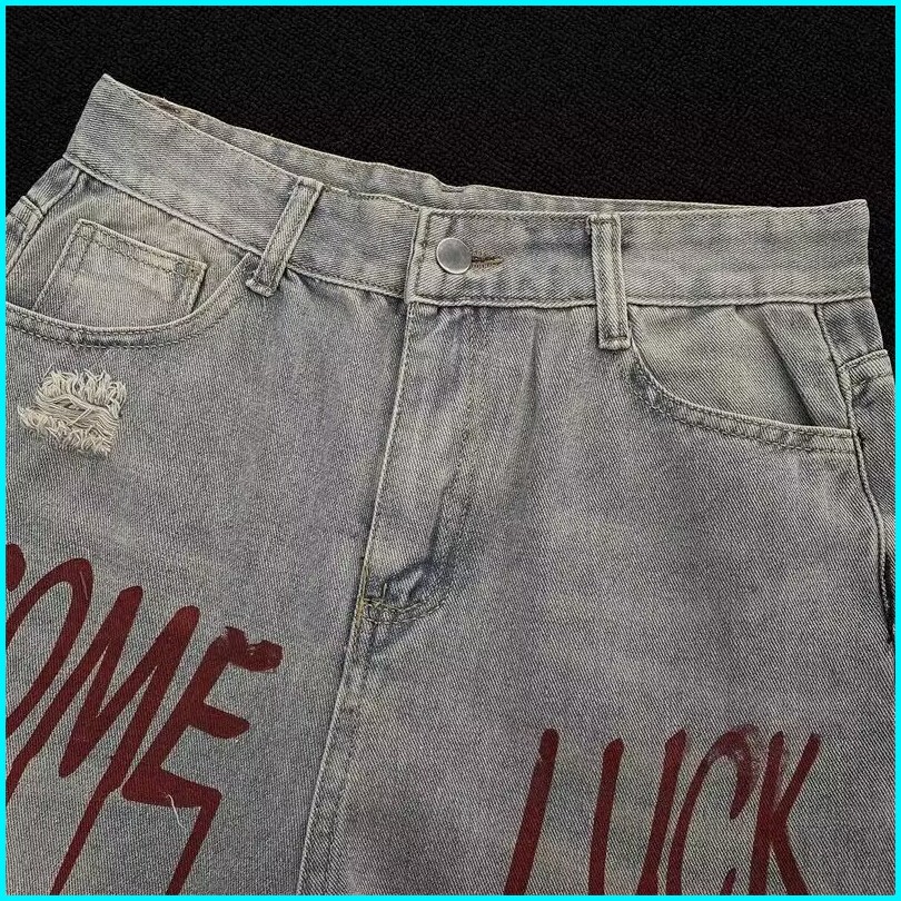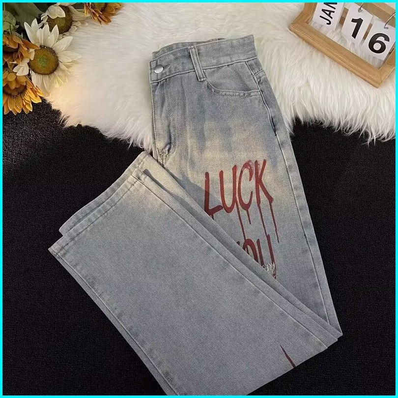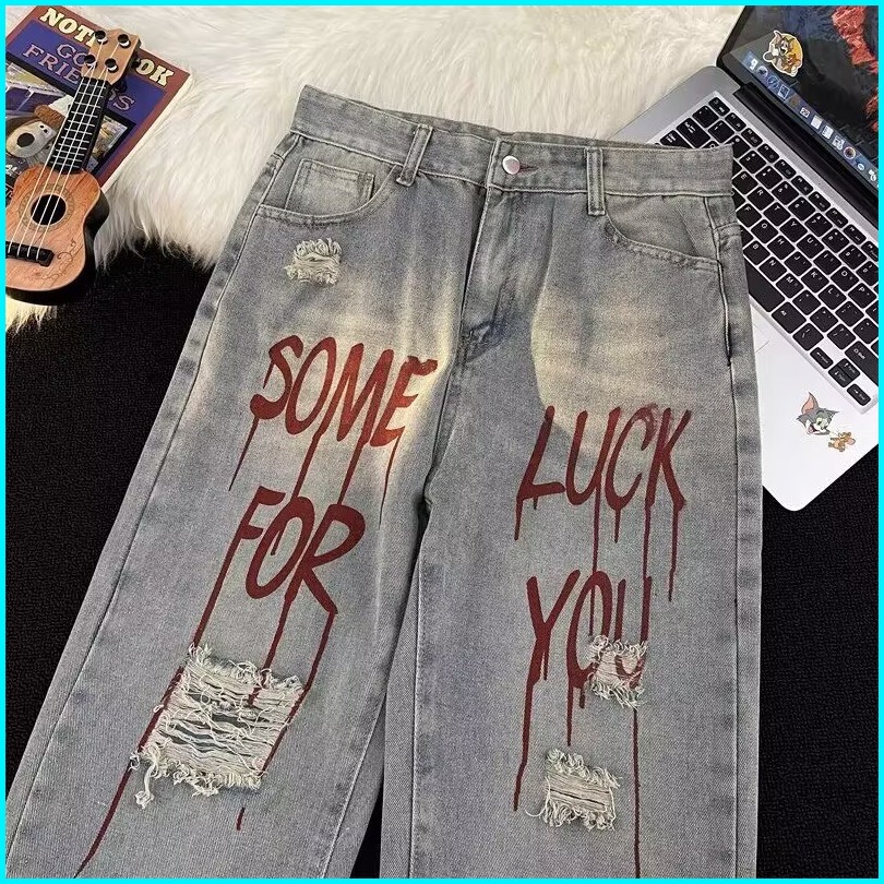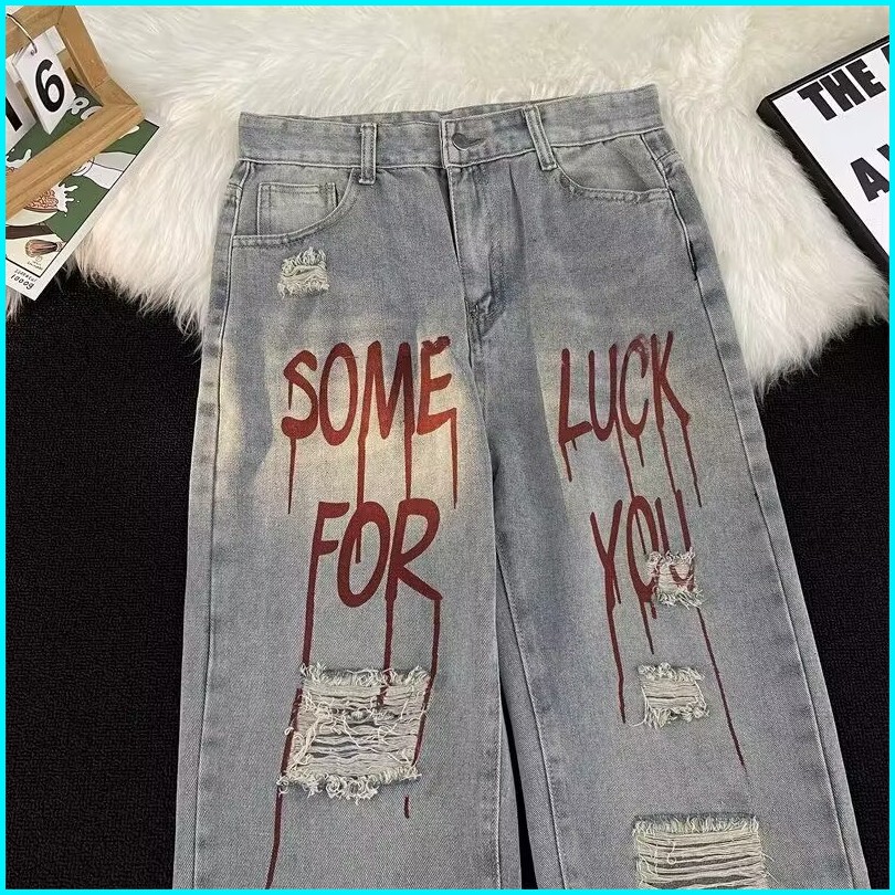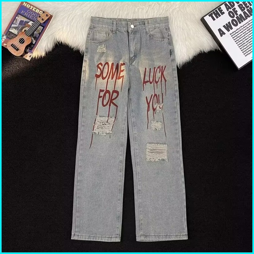Fashion Korea Retro Graffiti Robek Celana Jeans Longgar Kaki Lebar Lurus