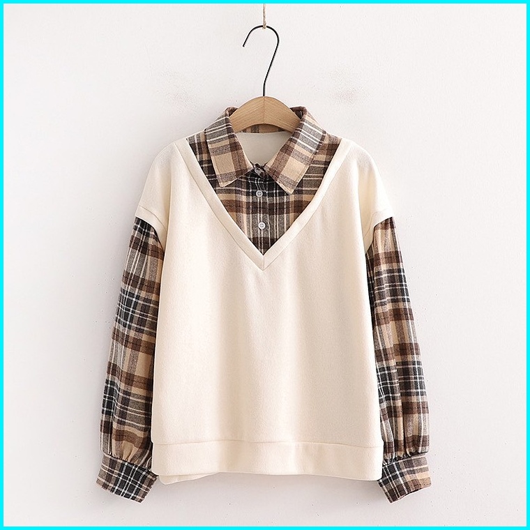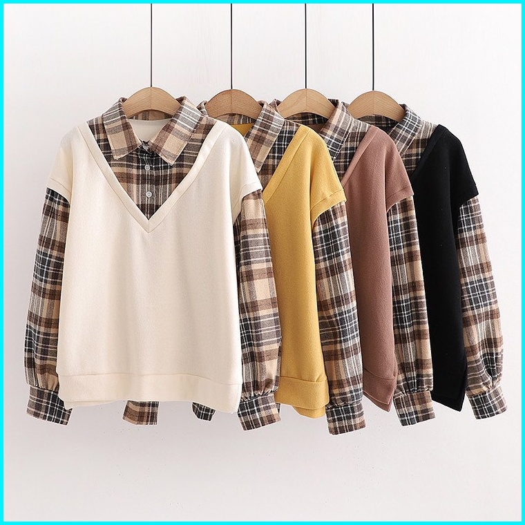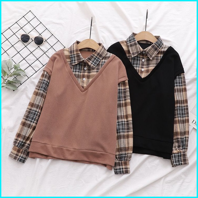 Vallina Kimberly Flanel Blouse Combi Fold Terry Shirt Atasan Kemeja Flannel Top Muslim Wanita Premium Korean Style