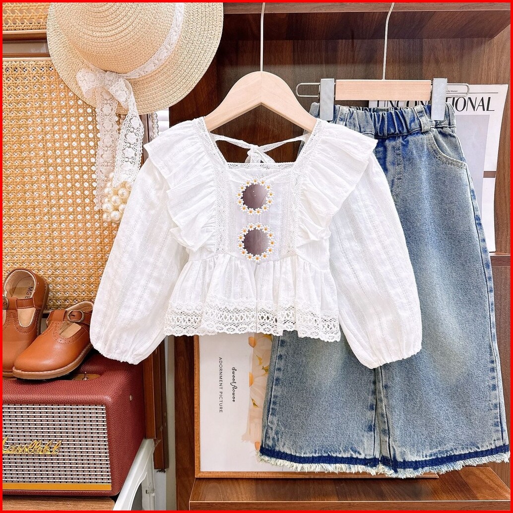 363751 - Setelan Baju Blouse Lengan Panjang Celana Panjang Jeans Fashion Anak Perempuan - Motif Soft Lace