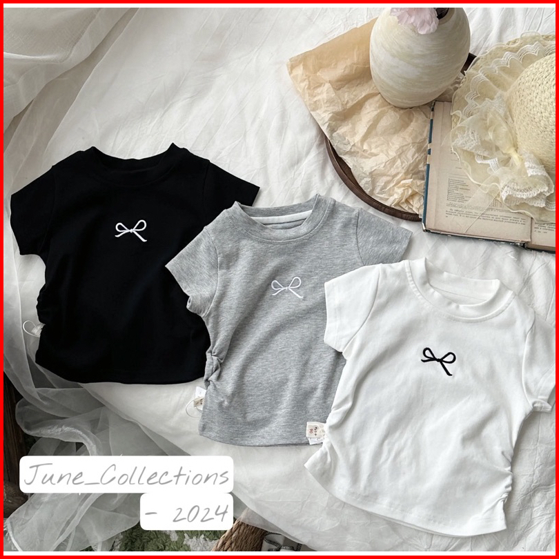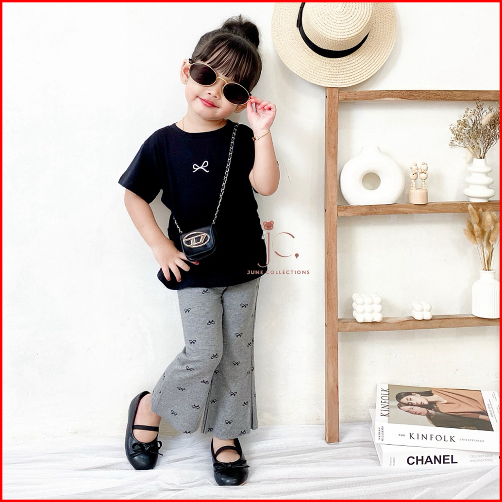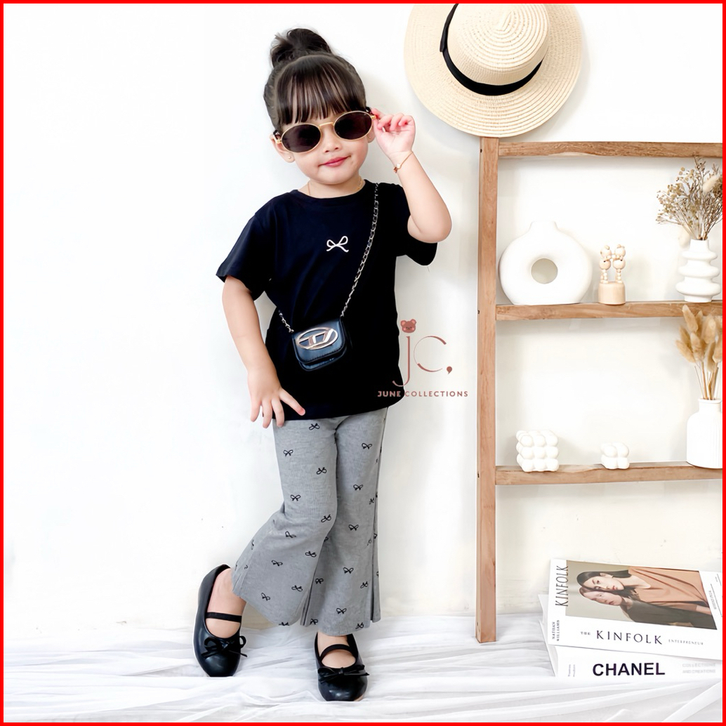 Junecollections Kaos Lengan Pendek Serut Ala-ala Korean Girl Motif Pita Celana Panjang Anak Perempuan Hits Kekinian Moti