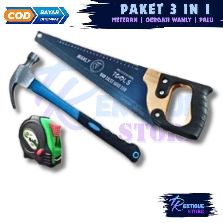 Paket 3 Pcs alat Pertukangan Meteran 5 M Gergaji kayu dan Palu 2 in 1 Gagang Fiber