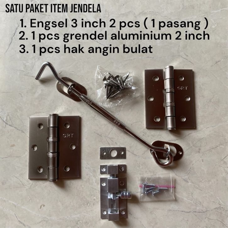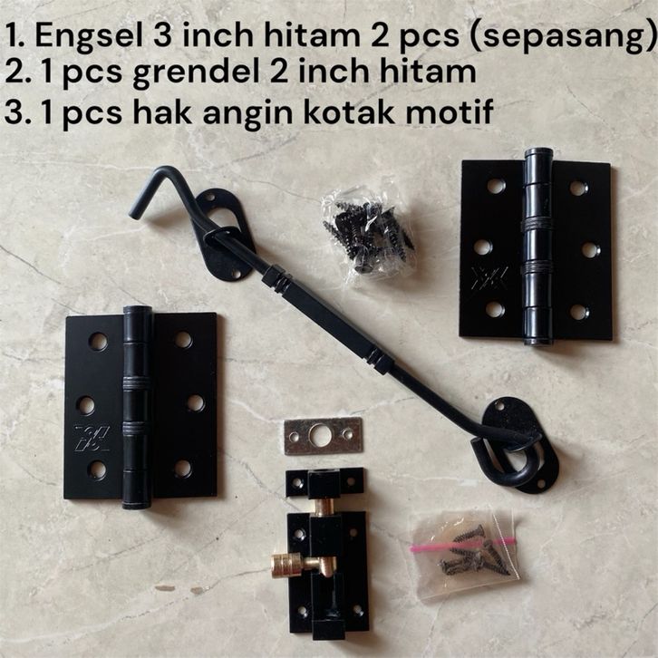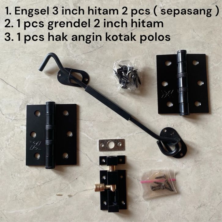 Paket Komplit Jendela 3 inch Hitam Engsel 3 inch Grendel 2 inch Hak Angin 2 cm