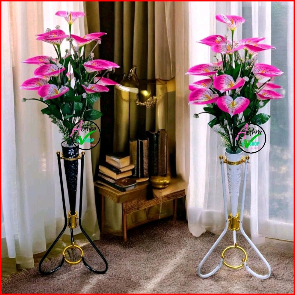 Bunga Hiasan Sudut Ruangan Anthurium Lily 18 Kuntum Lengkap Dengan Vas Standing Besi Pot Plastik Dekorasi Ruangan