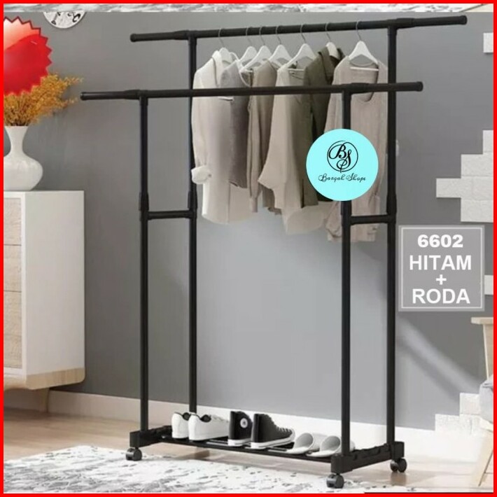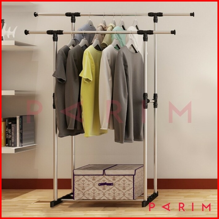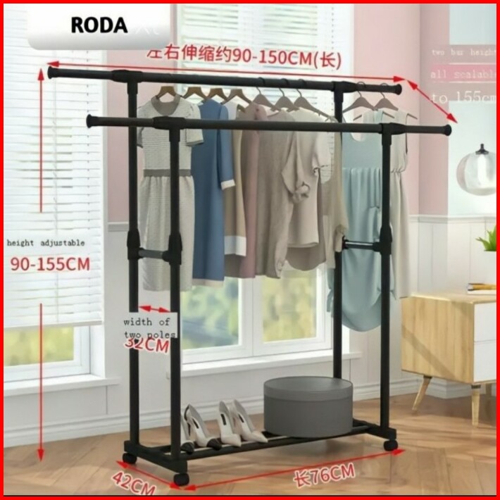 Rak Jemuran Baju Pakaian Lipat Double Stainless Stell Dgn 4 Roda