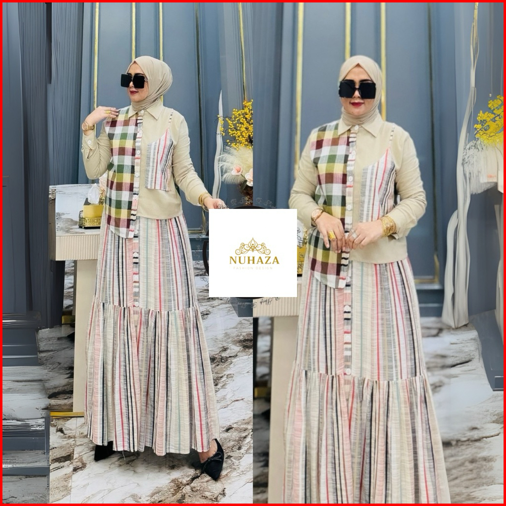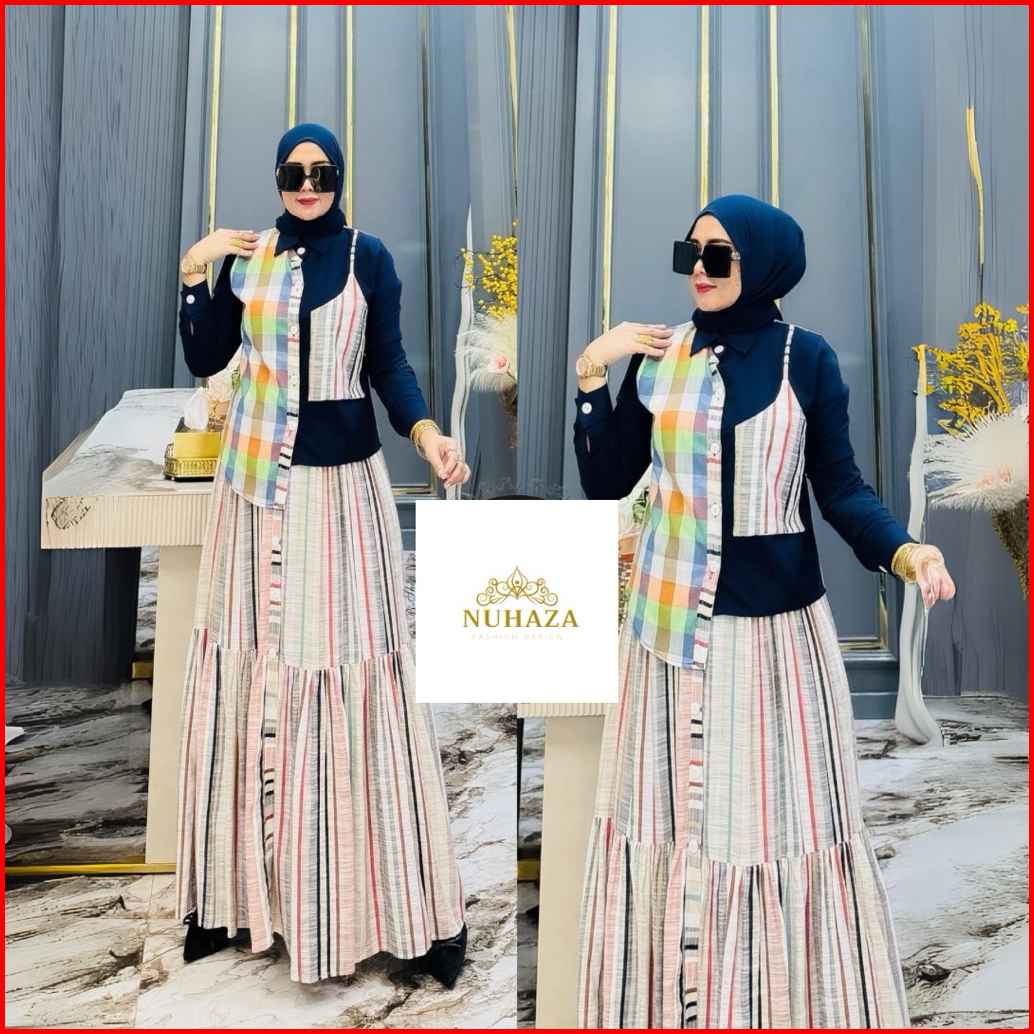 Baju Stelan Rok Set Rok Pakaian Wanita Dewasa Bahan Katun Linen Flanel Kotak Kotak Kombinasi Salur Motif Polos Warna Nav