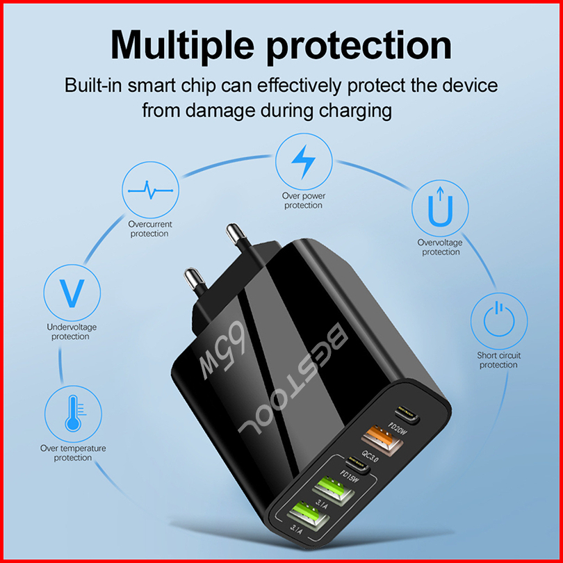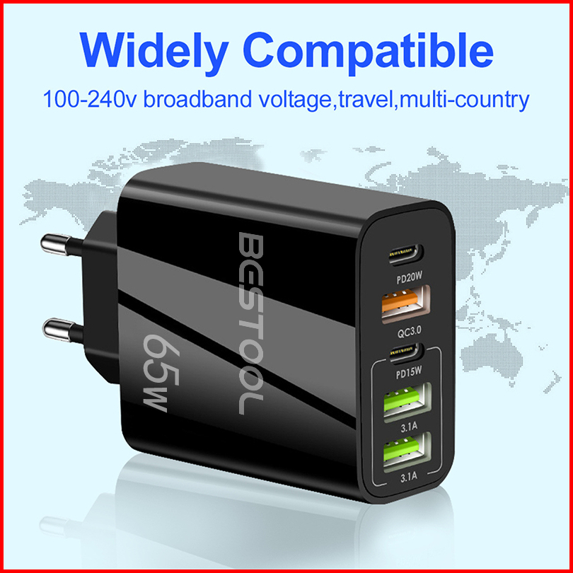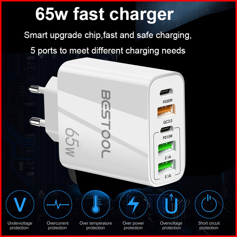 Bestool 65w Adapter Charger Usb Travel Charger Quick Charging Type C 2pd 3usb Adaptor Untuk I-phone Android Adoptor Char
