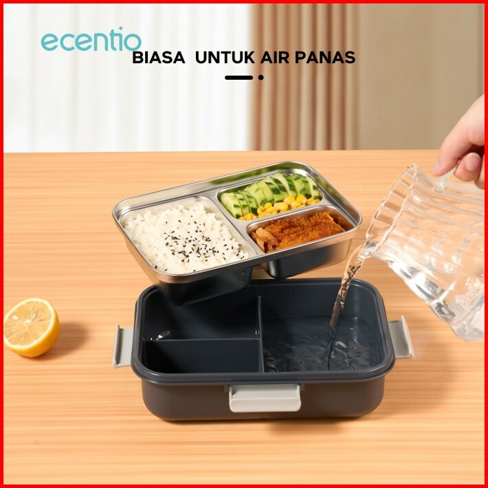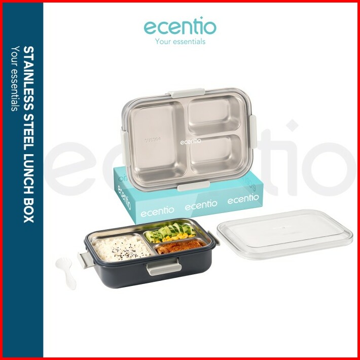 1.0 Anti Tumpahecentio Lunch Box Stainless Portable 850ml Sekat 3 Tempat Makan Kecil Free Sendok