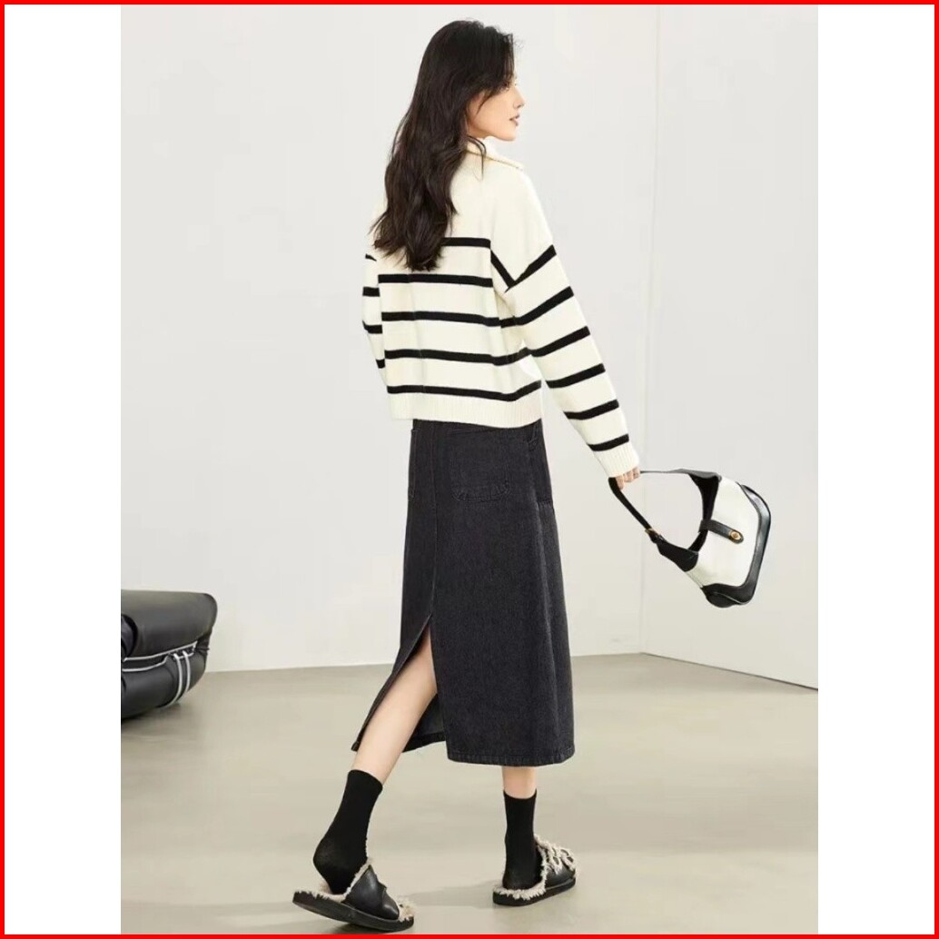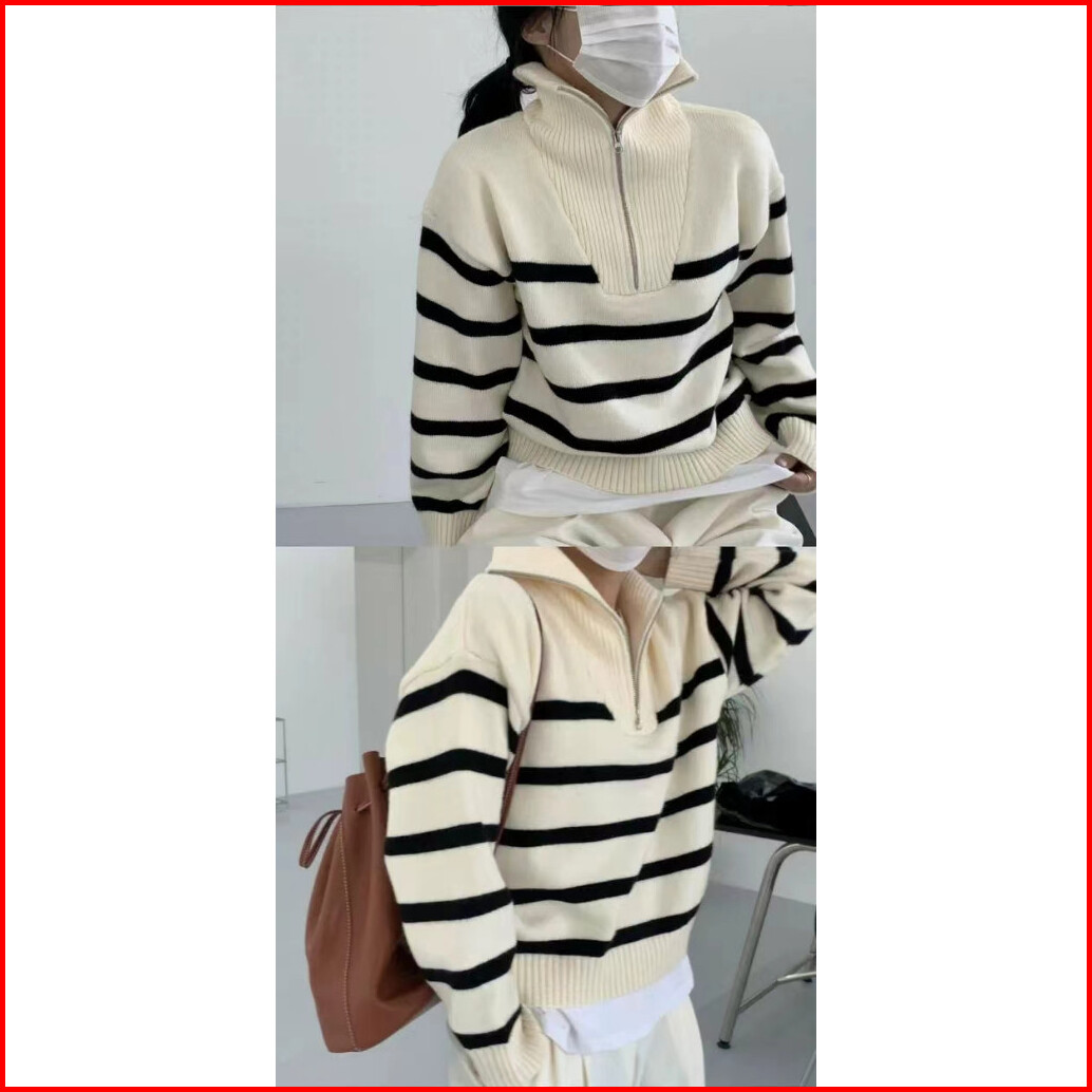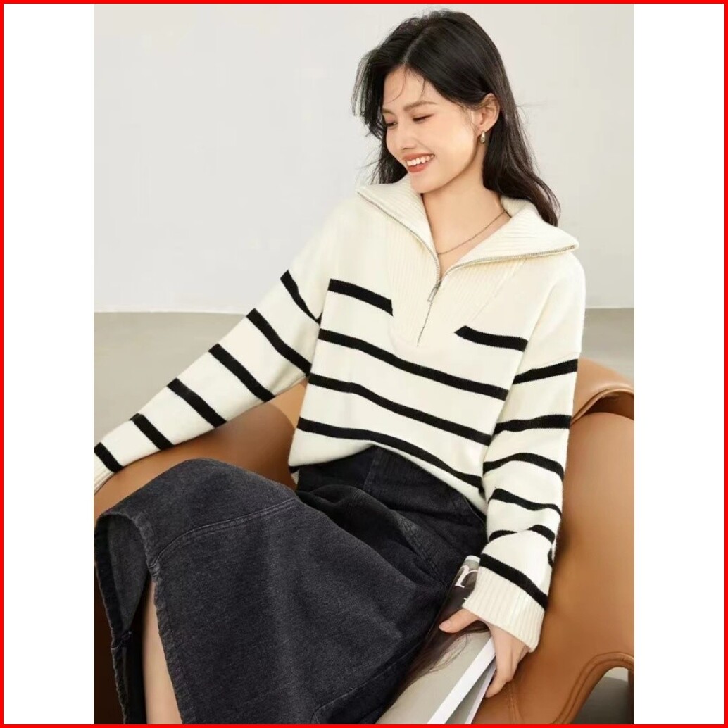 Shenning Sweater Stripes Baggy Fit Sweater Polo Rajut Wol Sweater Zipper Casual Atasan Sweater Wanita