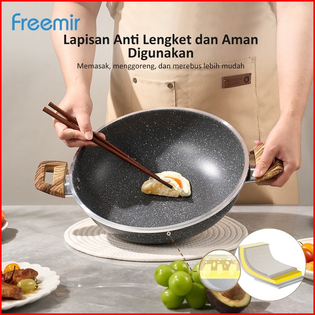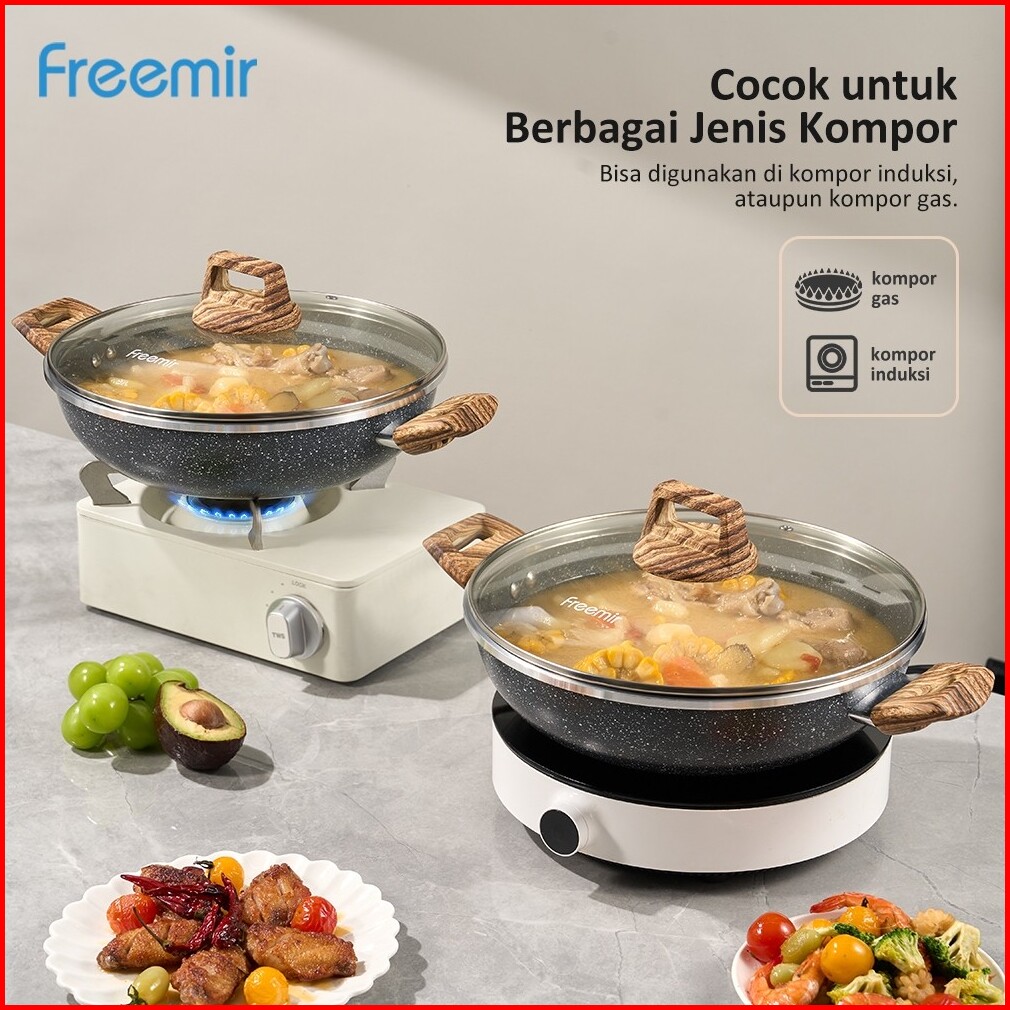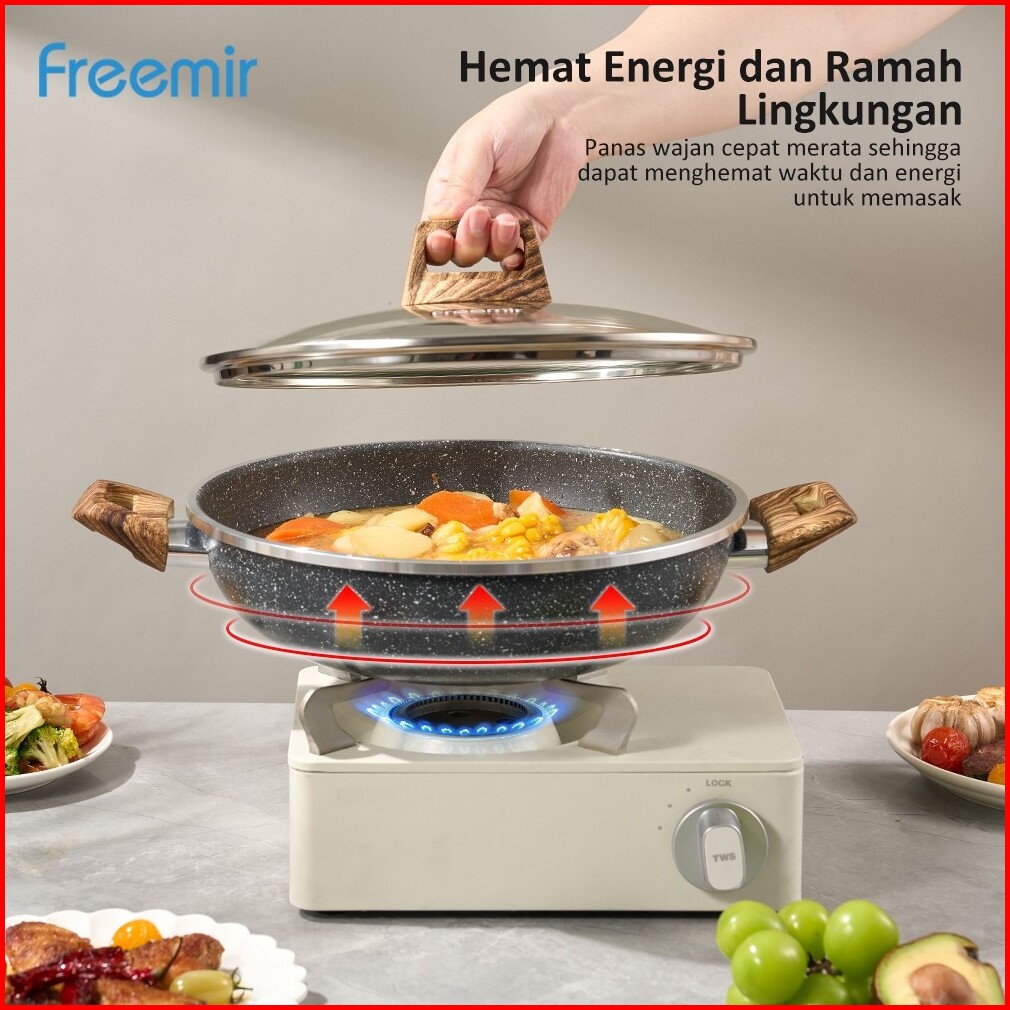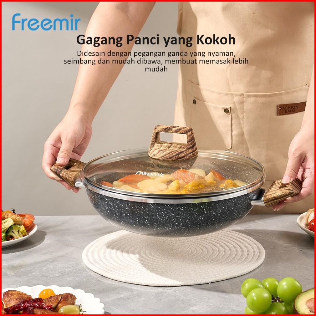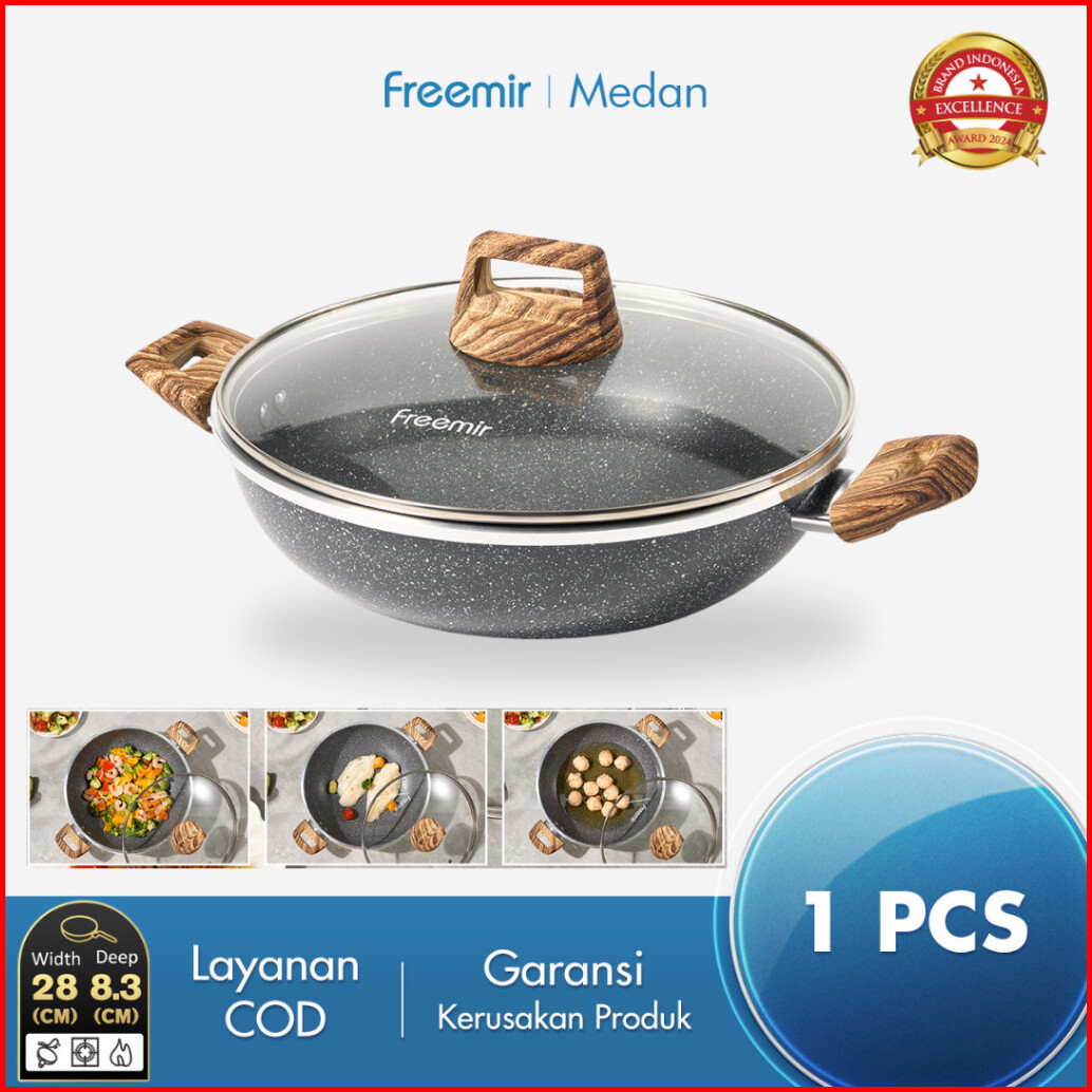 Wajan Kuping 28cm Double Bottom Tutup Kaca Hitam Marble Coating Anti Lengket