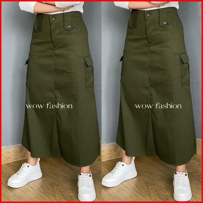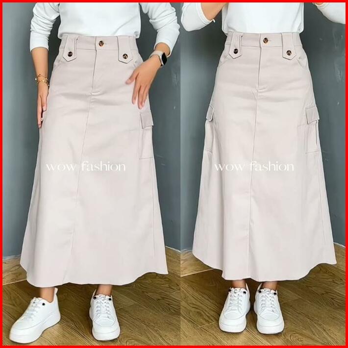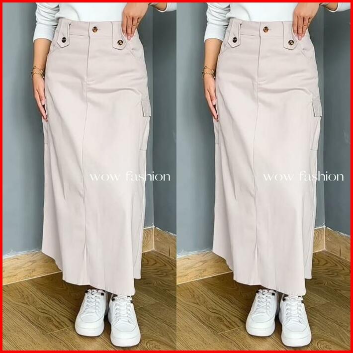 Ym-maira Rok Cargo Skirt Panjang Katun Twill Wanita Premium Kancing Karet Standar Jumbo Navy High