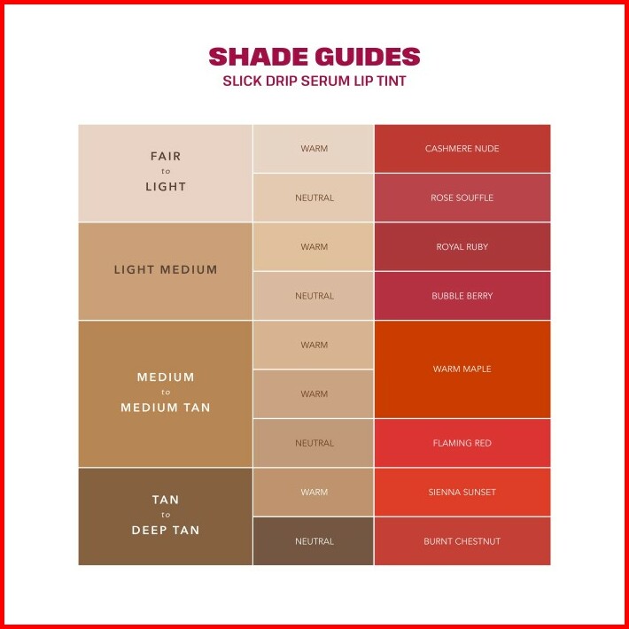 CASHMERE NUDE, ROSE SOUFFLE, ROYAL RUBY, FLAMING RED, BUBBLE BERRY, SIENNA SUNSET, WARM MAPLE, BURNT CHESTNUT