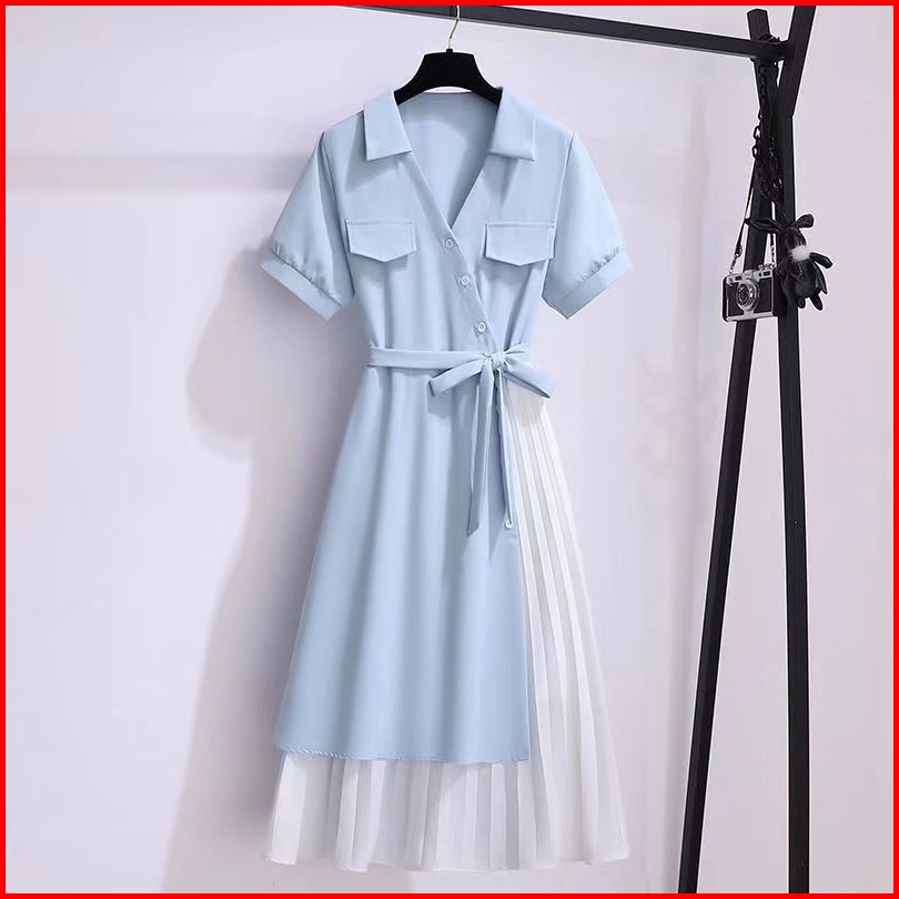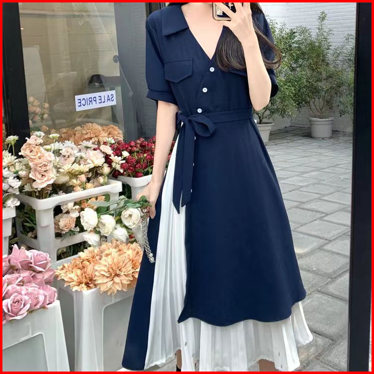 Baru Pinggang Ramping Gaun Ramping Warna Kontras Jahitan Rok Panjang Gaya Korea Dress Korea