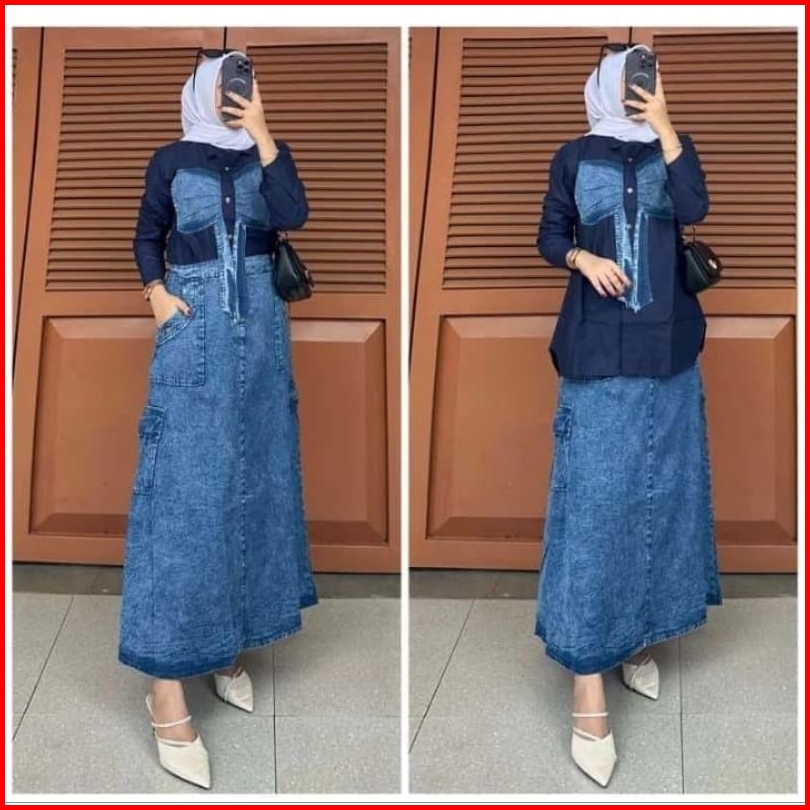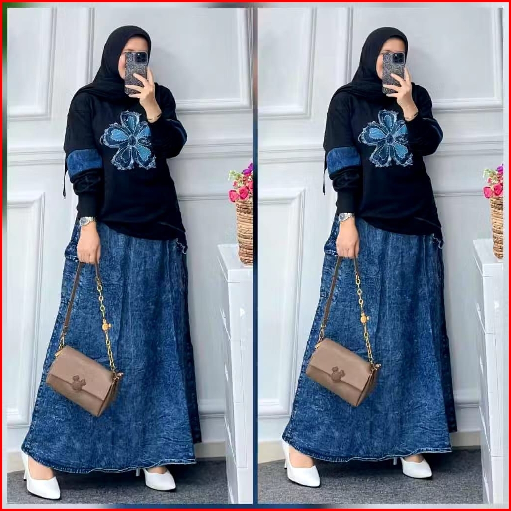 One Set Wanita Dewasa Atasan Combed 2in1 Set Rok Jeans Kekinian