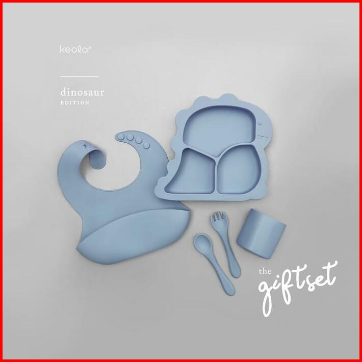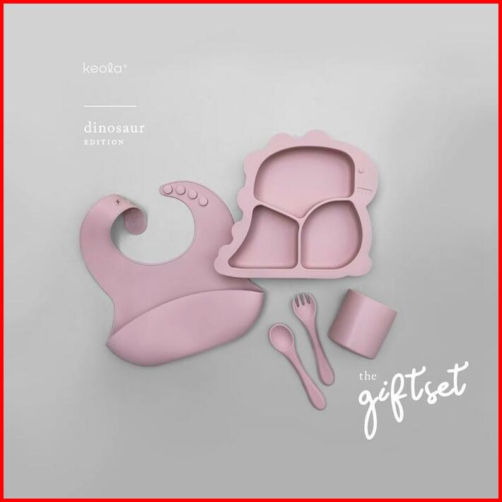 Keola -05 Pcs Set Dino Silicone Gift Set Premium Peralatan Makan Bayi Silicone Mpasi Premium Garpu Piring Pink Sendok