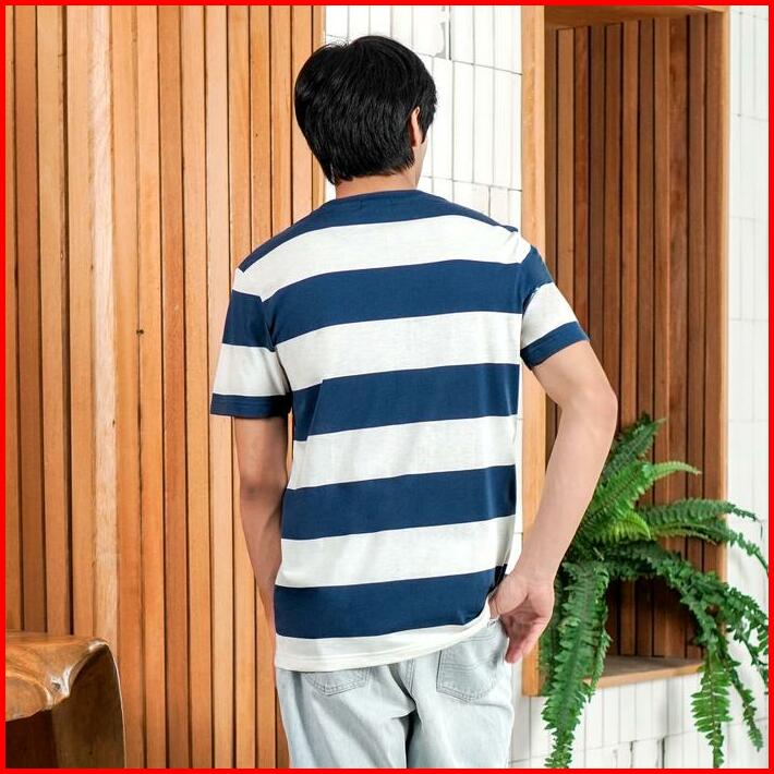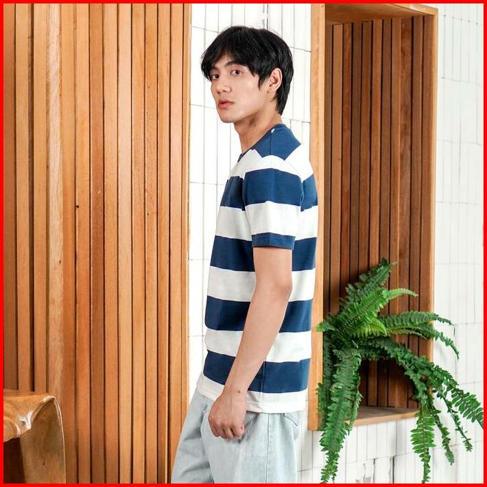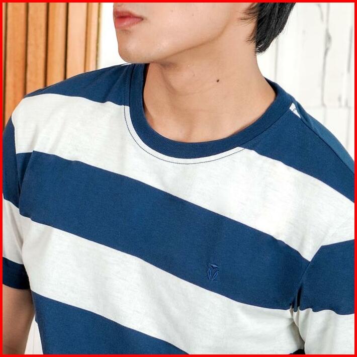 Matsuda T Shirt Pria Kaos Stripe Nanao Baju Katun Garis Blue Teal Offwhite