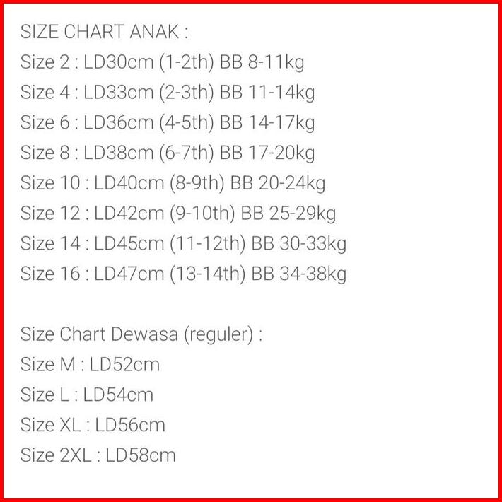 ANAK SIZE 2, ANAK SIZE 4, ANAK SIZE 6, ANAK SIZE 8, ANAK SIZE 10, ANAK SIZE 12, ANAK SIZE 14, ANAK SIZE 16, DEWASA SIZE M, DEWASA SIZE L, DEWASA SIZE XL, DEWASA SIZE 2XL, DEWASA SIZE 3XL, DEWASA SIZE 4XL