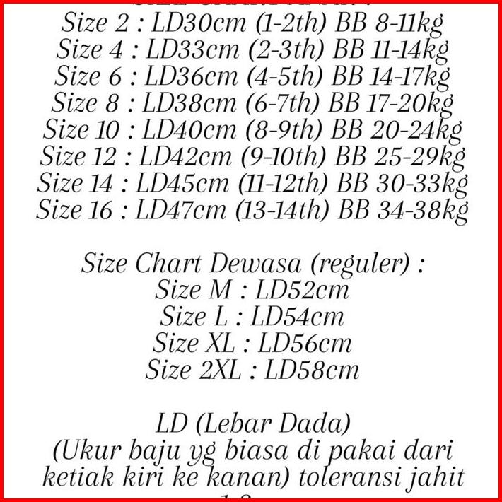 ANAK SIZE 2, ANAK SIZE 4, ANAK SIZE 6, ANAK SIZE 8, ANAK SIZE 10, ANAK SIZE 12, ANAK SIZE 14, ANAK SIZE 16, DEWASA SIZE M, DEWASA SIZE L, DEWASA SIZE XL, DEWASA SIZE 2XL, DEWASA SIZE 3XL, DEWASA SIZE 4XL