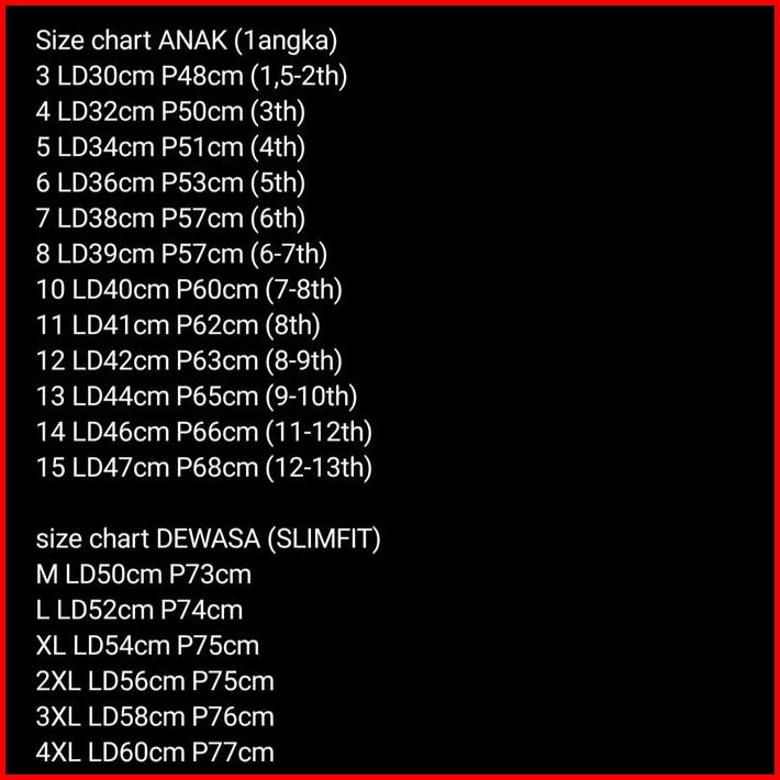 ANAK SZ 2, ANAK SZ 4, ANAK SZ 6, ANAK SZ 8, ANAK SZ 10, ANAK SZ 12, ANAK SZ 14, ANAK SZ 16, DEWASA SZ M, DEWASA SZ L, DEWASA SZ XL, DEWASA SZ 2XL, DEWASA SZ 3XL, DEWASA SZ 4XL