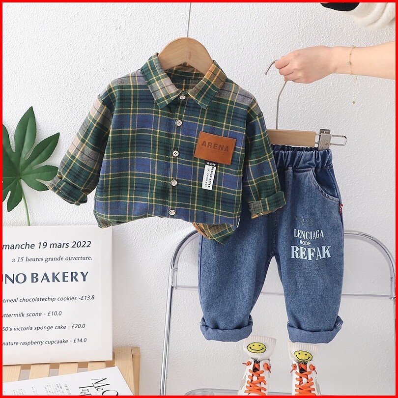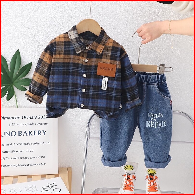 Setelan Kemeja Anak Laki Laki Import Setelan Kemeja Motif Kotak Kotak Biru Anak Balita Impor Stelan 2pcs Kemeja Motif Ta