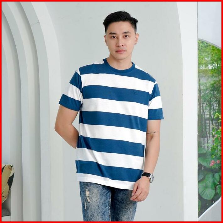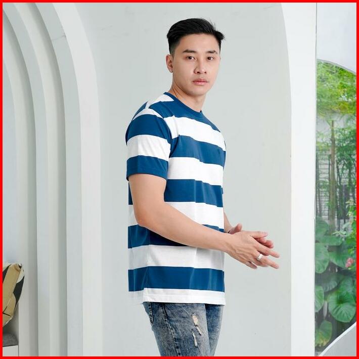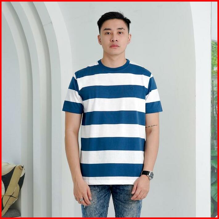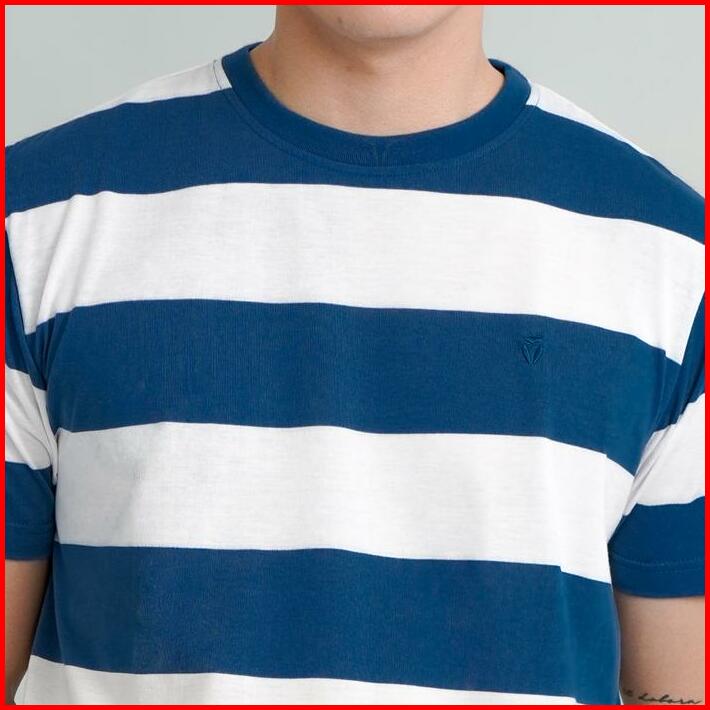 Matsuda T Shirt Pria Kaos Stripe Nanao Baju Katun Garis Steel Blue White