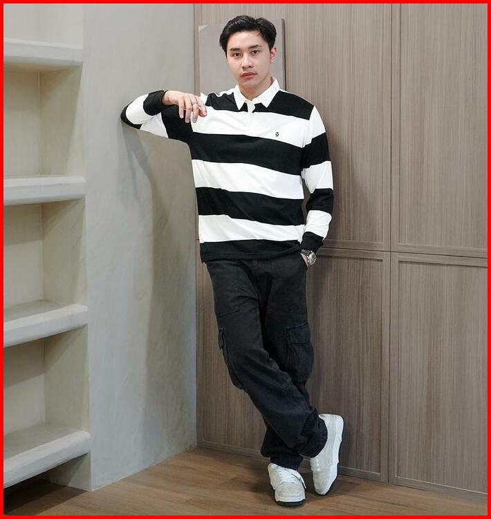 Matsuda Kaos Rugby Polo Shirt Katun Pria Lengan Panjang Nagai Black White
