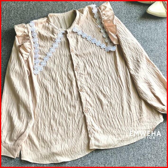 Emweha Blouse Leora Kerah Renda Polo Linen Atasan Wanita Full Kancing Baju