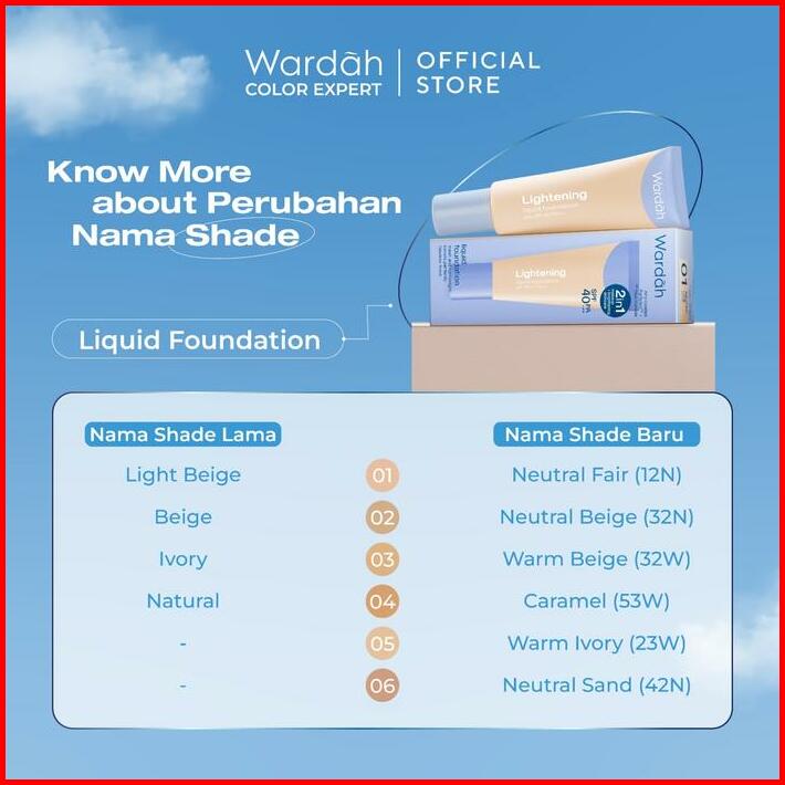 01 NEUTRAL FAIR(12N), 02 NETRAL BEIGE(32N), 03 WARM BEIGE (32W), 04 CARAMEL (53W), 05 WARM IVORY (23W), 06 NEUTRAL SAND (42N)
