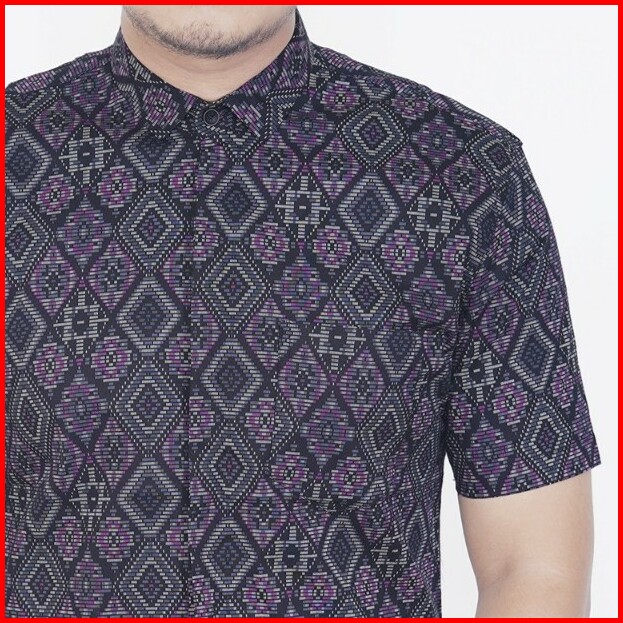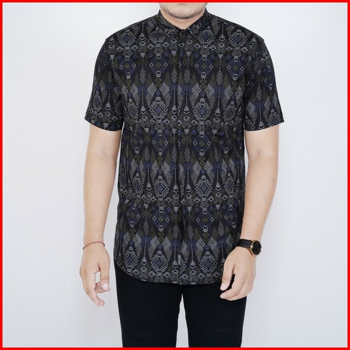 Kemeja Batik Pria Slim Fit Lengan Pendek Cotton Stretch Hitam Katun Baju Nyaman