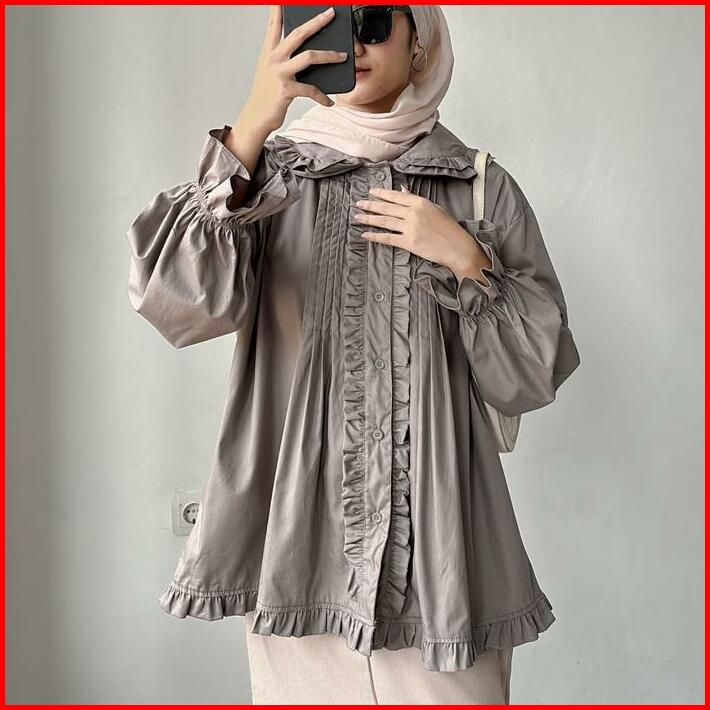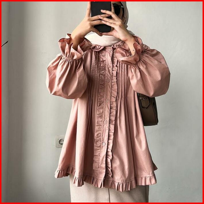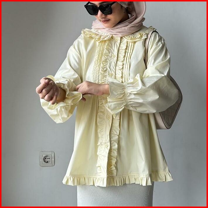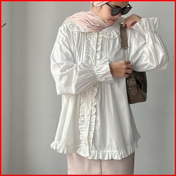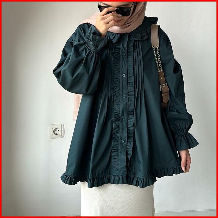 Leonie Poplin Blouse Atasan Baju Panjang Katun Lembut Oversize Wanita Motif Ruffle