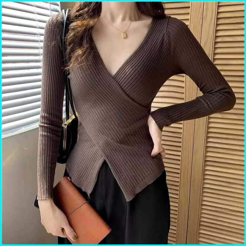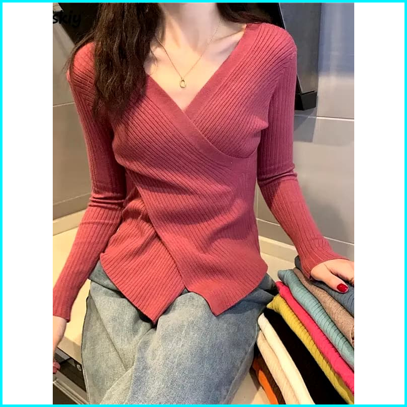 Top Knit V-neck Korean Style Wrap Top - Atasan Rajut Wanita Lengan Panjang