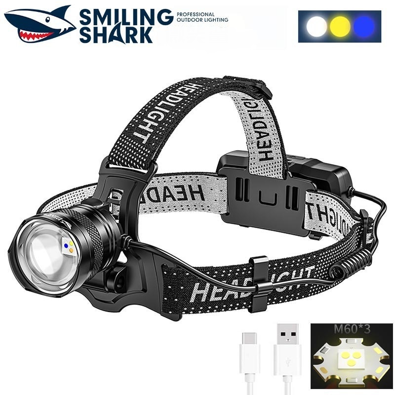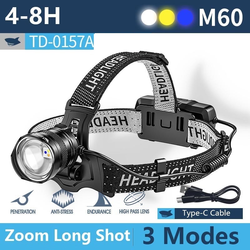 SENTER KEPALA 3 CAHAYA SMILING SHARK TD-0157A LED 60W M60 - CAHAYA TERANG - ZOOM LASER - TYPE-C