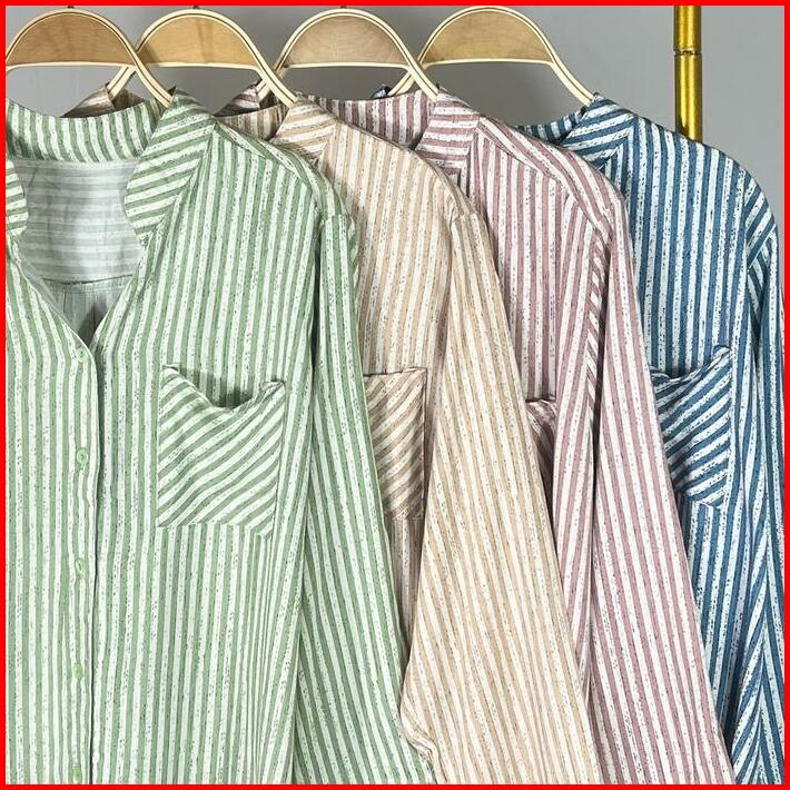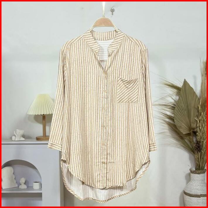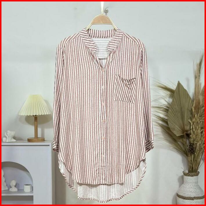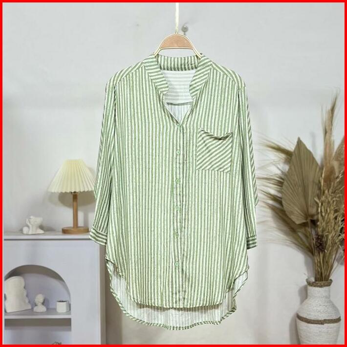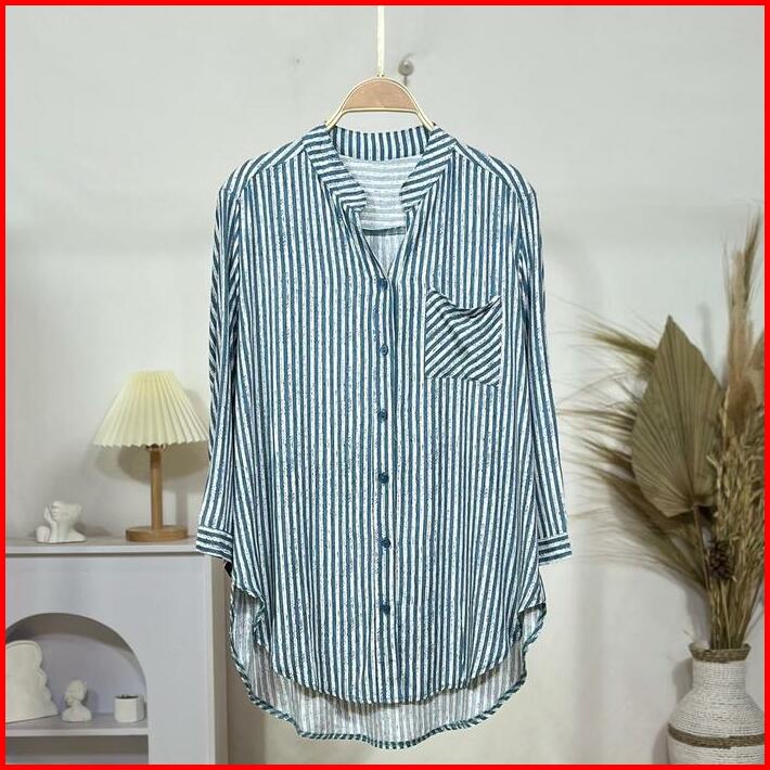 Kemeja Blouse Stripe Wanita Rayon Krah Shanghai Lengan 7 8 Basic Kancing Simple Busui Casual Lembut High Nyaman Garis Ba