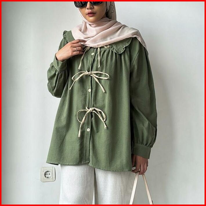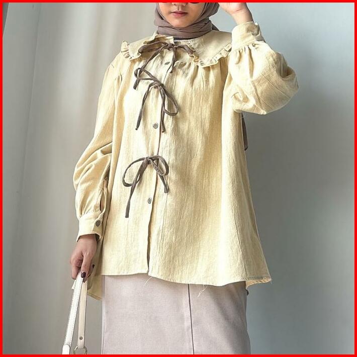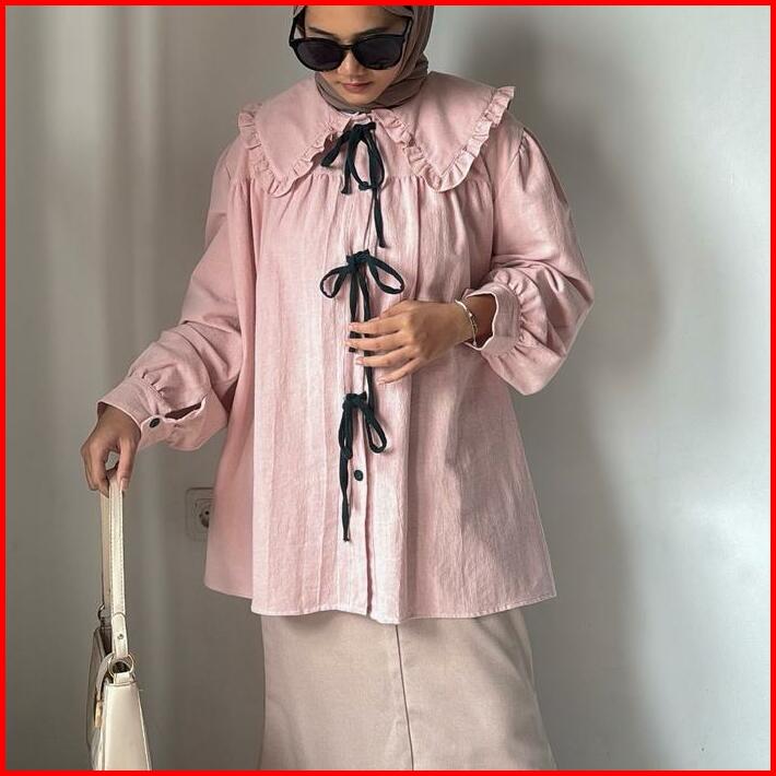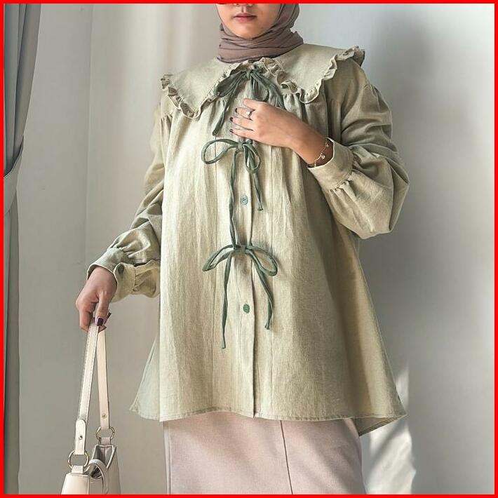 Kemeja Linen Ruffle Pita Polos Baju Kancing