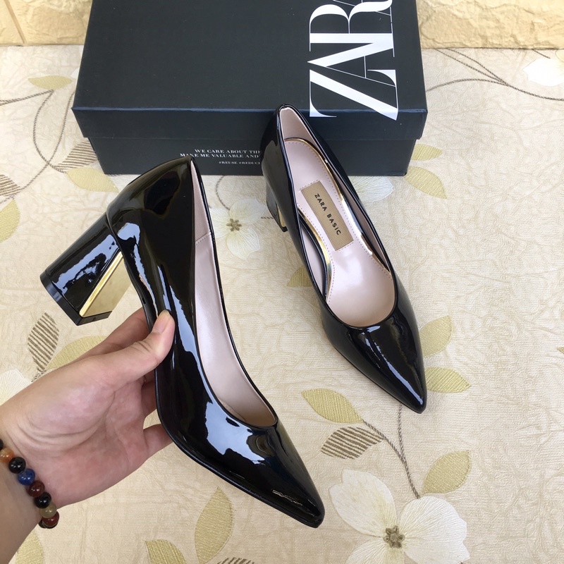 Sepatu ZR-141 Block Heel Pump Kulit Hitam Suede Kuning