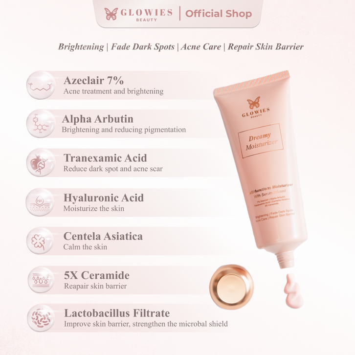 GLOWIES BEAUTY Dreamy Moisturizer 80ml Azelclair 7% Redakan Jerawat & PIE Dr Incognito Approve