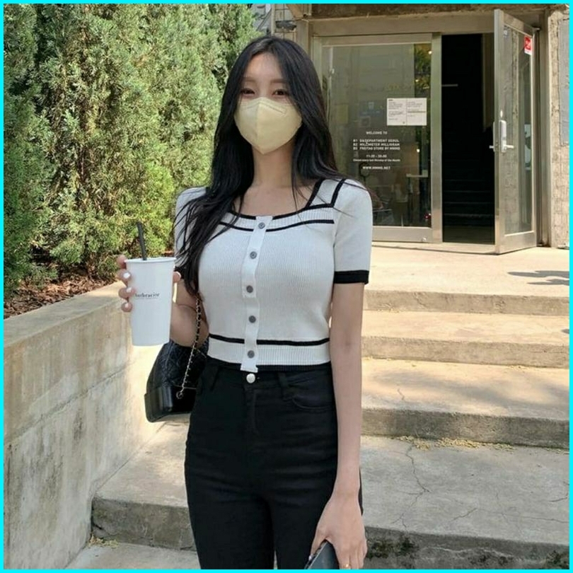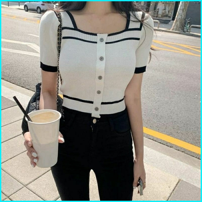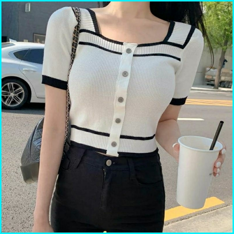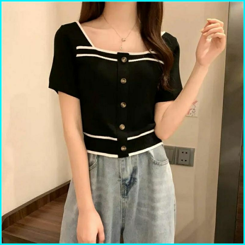 Atasan Rajut Wanita Square Neck Kancing