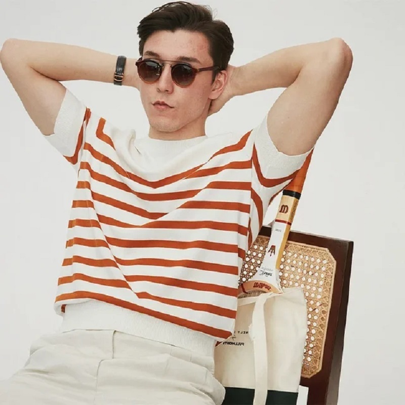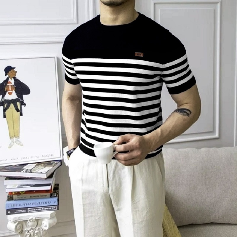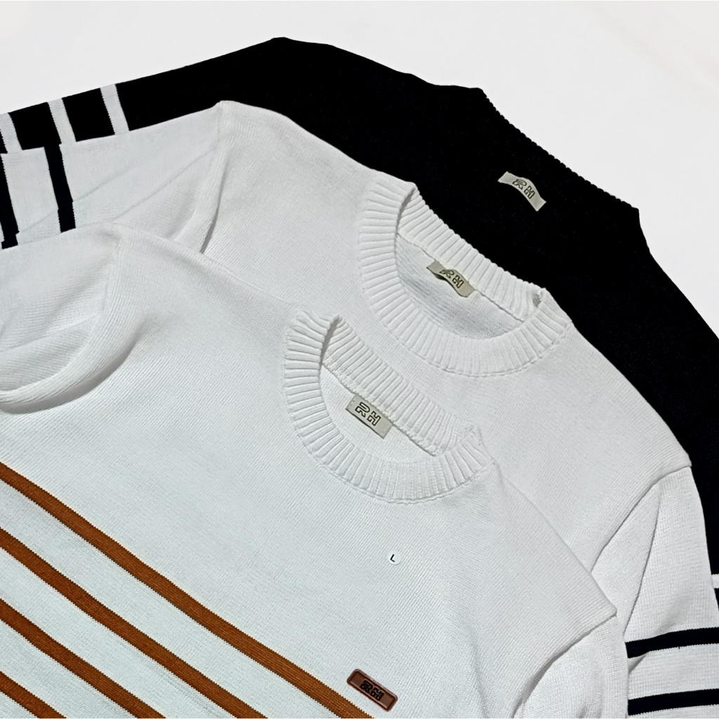 RHcollections baju rajut pria lengan pendek kerah bulat crewneck motif setrip belang garis mewah elegan Hitam Putih coral top terbaru