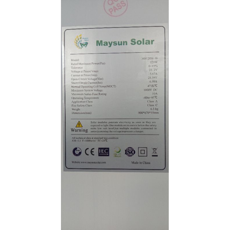 Solar Panel Maysun 120Wp Mono Original Solar Cell Panel Surya