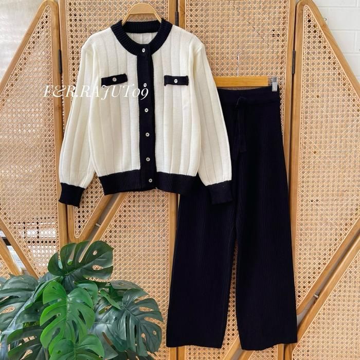 F&R Oneset Amisha Cardigan Rajut Stripe Lengan Panjang Setelan Celana Kulot Wanita Premium Kekinian - Khaki Atasan saja