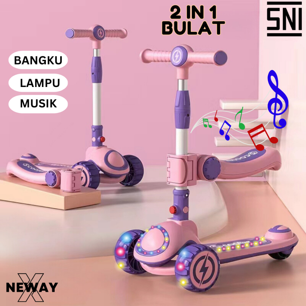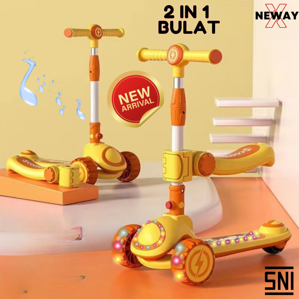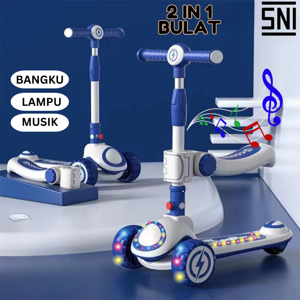 Skuter Anak Karakter Scooter Mainan Bulat 2 In 1 Lipat Duduk Roda Tiga Otoped Lampu Musik