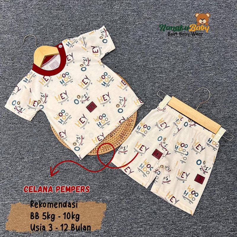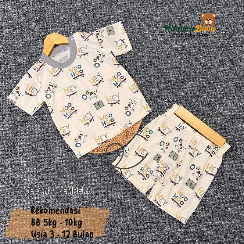 Nanaku Baby - Setelan Harian Bayi Lengan Pendek Kancing Pundak Celana Diapers Motif Huruf Hey Cream