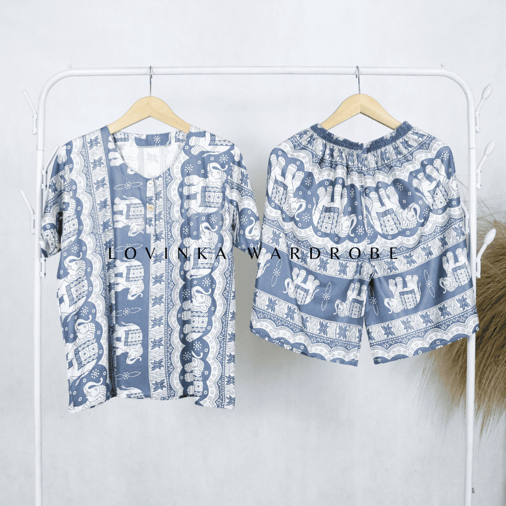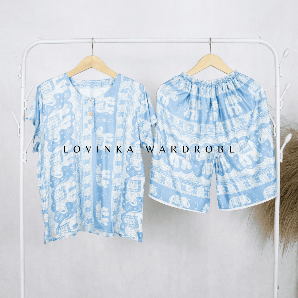 SETELAN BAJU TIDUR WANITA LENGAN PENDEK PIYAMA CELANA PENDEK MOTIF GAJAH BAHAN RAYON