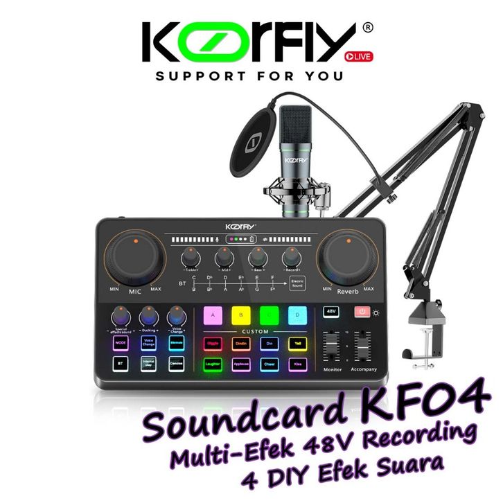 Soundcard Koorfly Kf04 Multi-Efek 48V Live Soundcard Live Mixer 4 DIY Efek Suara/12 Efek RGB/ Untuk Konten Kreator Audio