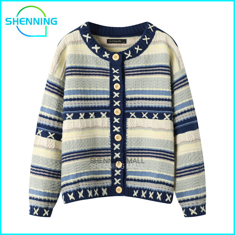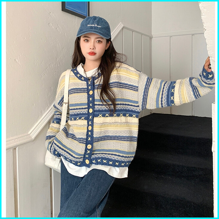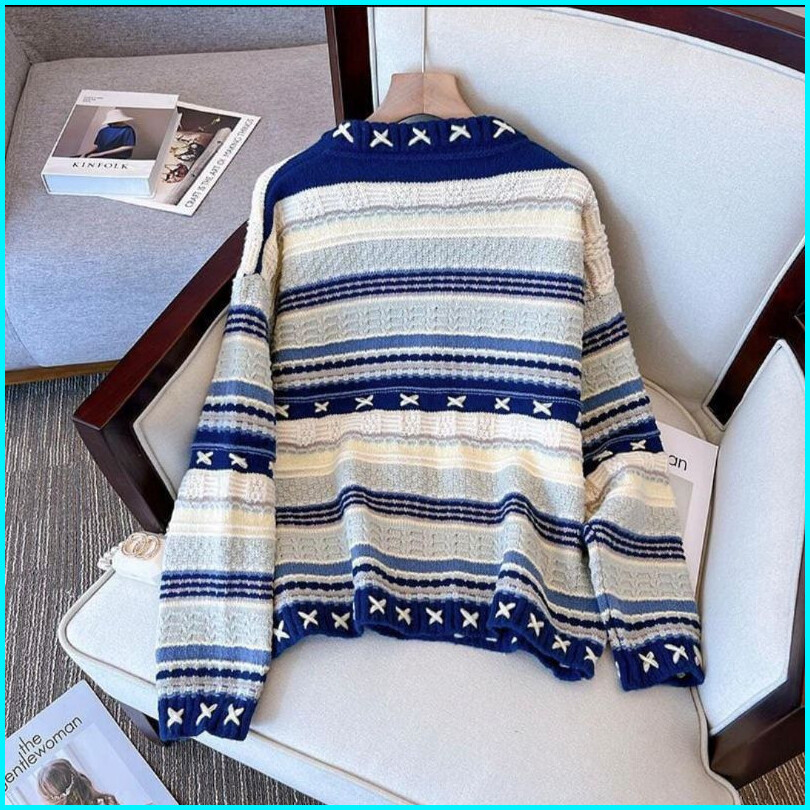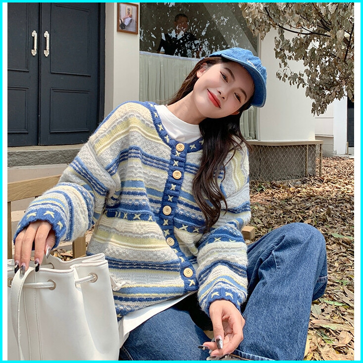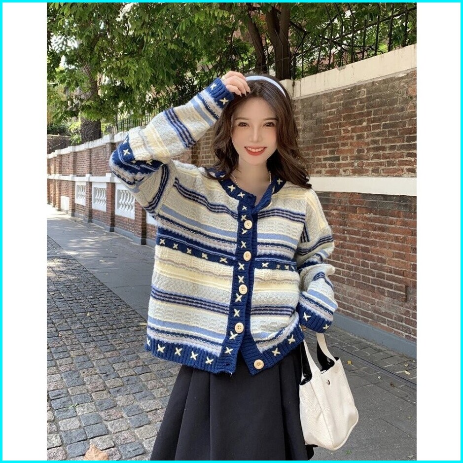 Shenning Cardigan Rajut Premium Outer Knit Terbaru Sweater Stripe Wanita Motif Stripe Biru